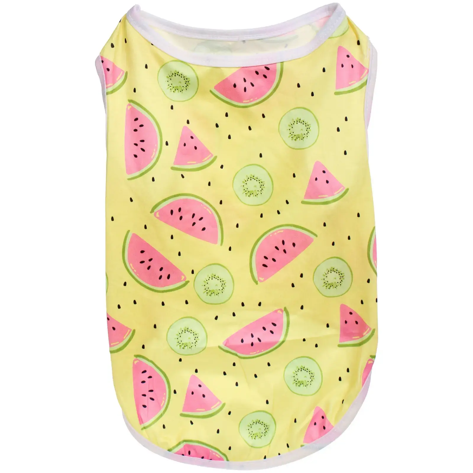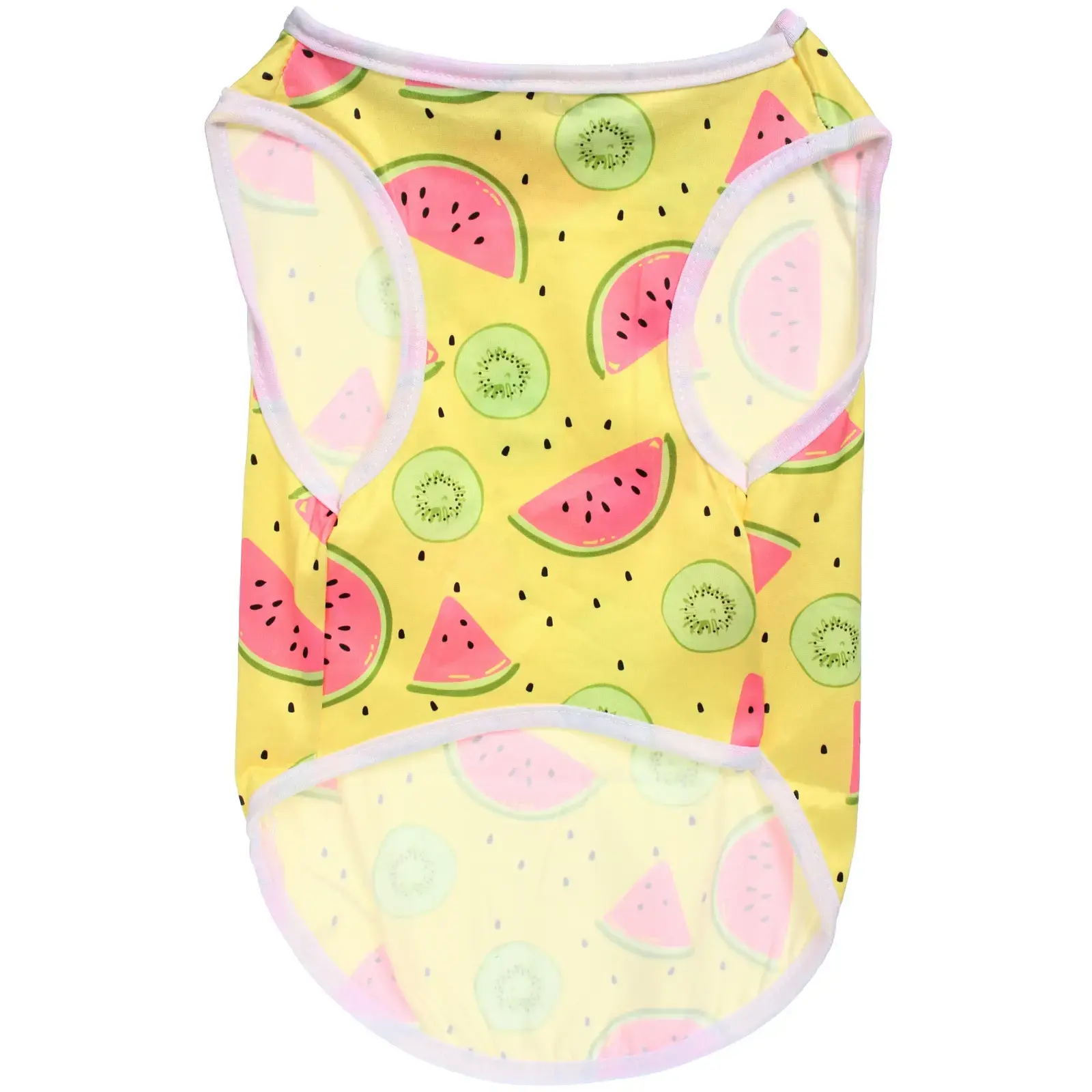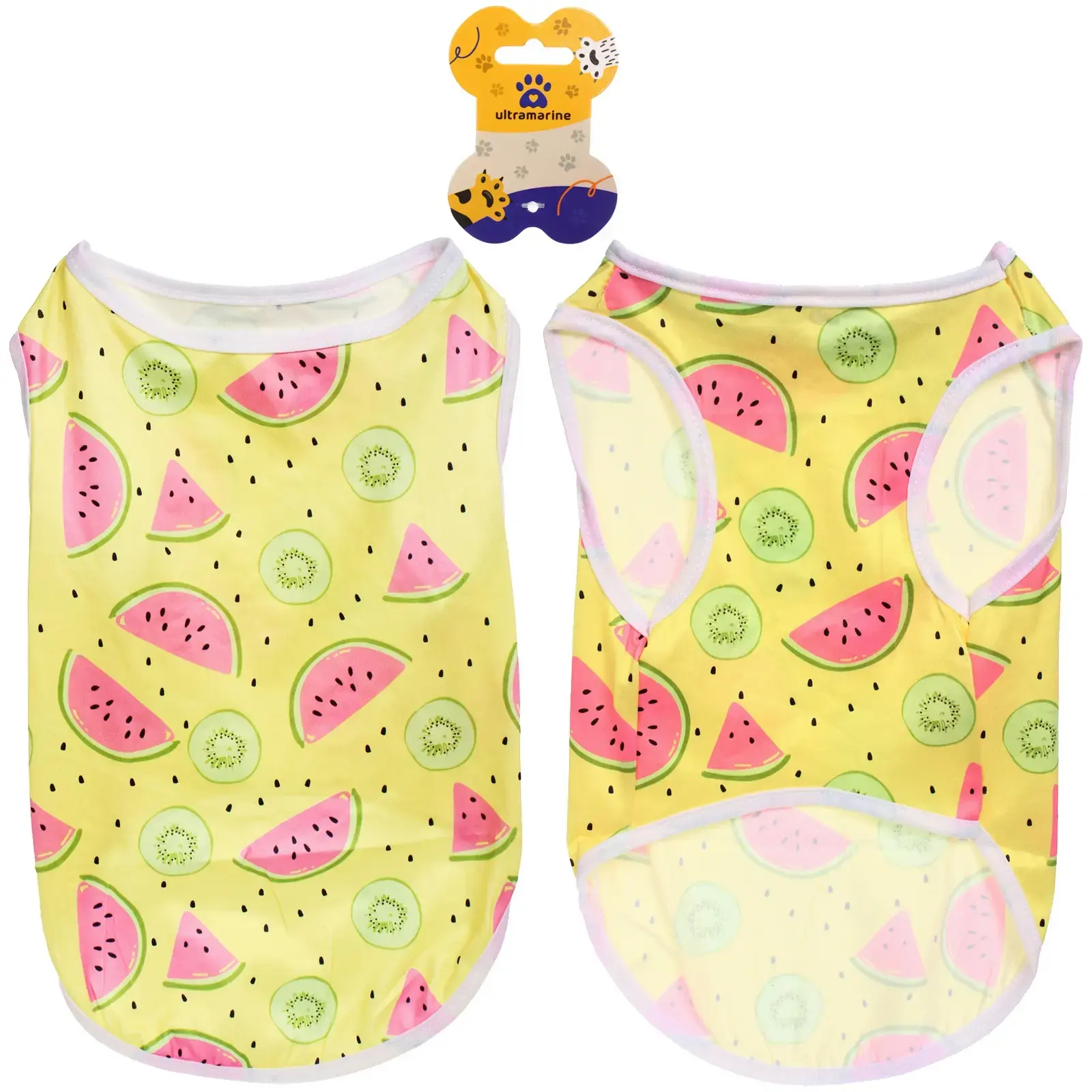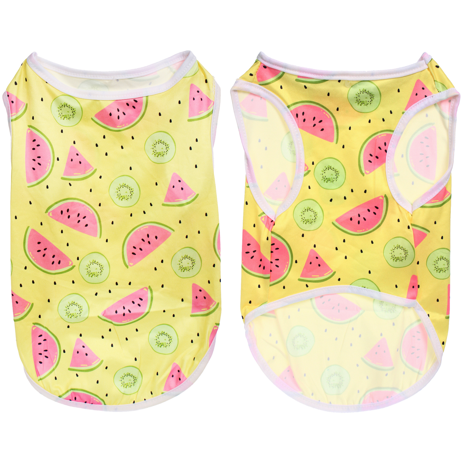 Майка предназначена для повседневного ношения и активного отдыха. Она легко надевается благодаря округлым вырезам для лапок и свободному крою. Подходит для домашних животных весом от 7 до 9 кг, с объемом груди 38 см и длиной спинки 33 см. Яркий желтый фон с принтом арбузов и киви добавляет игривости и радости в образ вашего питомца.