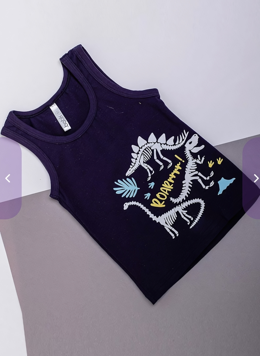 Подарите ребёнку комфорт и свободу движений с этой удобной и стильной майкой. Тёмно-синий цвет гармонично сочетается с эффектным принтом, включающим скелеты динозавров, зелёные листья и контрастные надписи «ROAR!!!». Дизайн привлекает внимание и понравится детям, а мягкий приятный на ощупь материал обеспечивает удобство в течение всего дня.