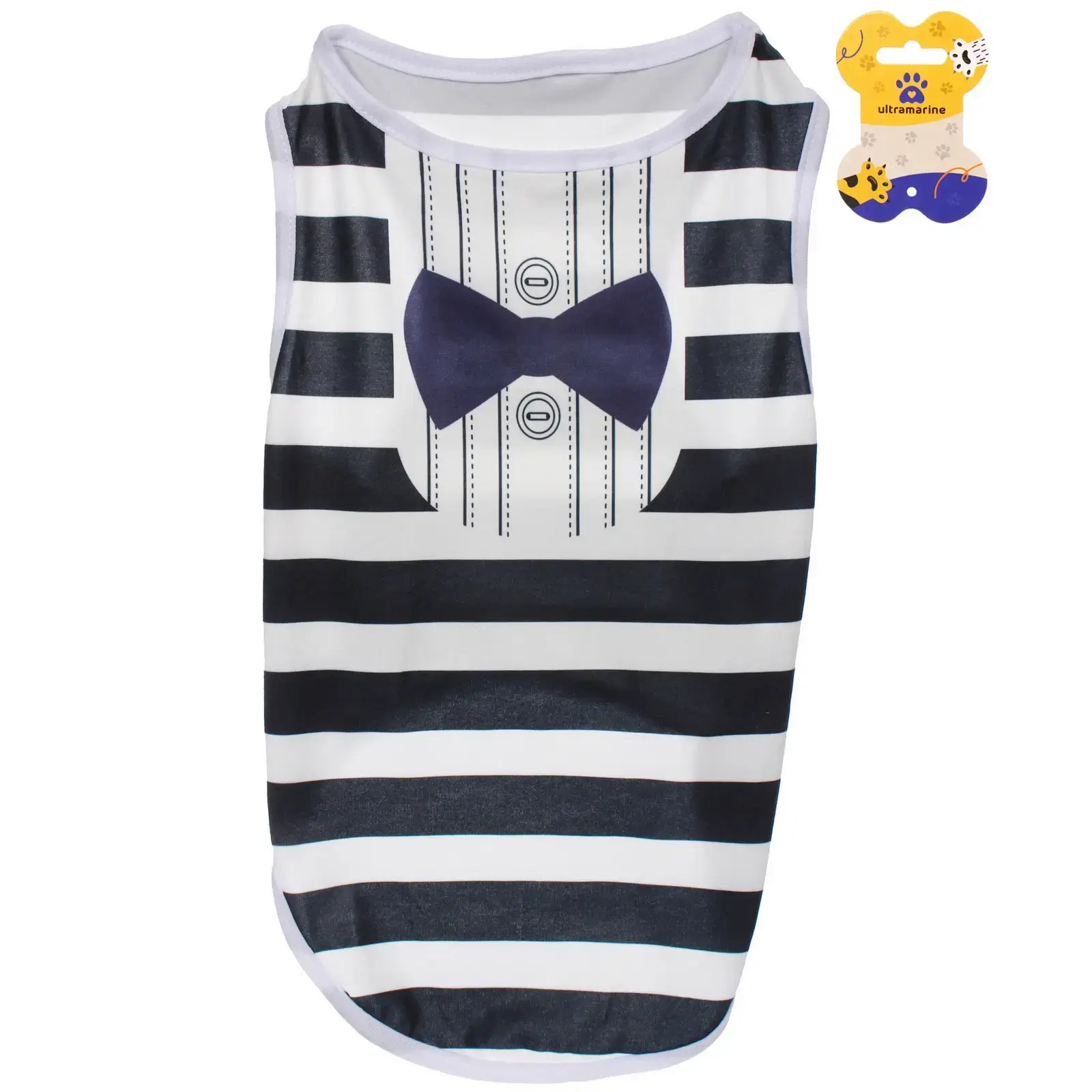Представляем майку 'БРО на стиле' – идеальное сочетание комфорта и элегантности для вашего четвероногого друга. Благодаря классическому принту в виде смокинга с галстуком-бабочкой, ваш питомец всегда будет выглядеть безупречно на любом мероприятии.