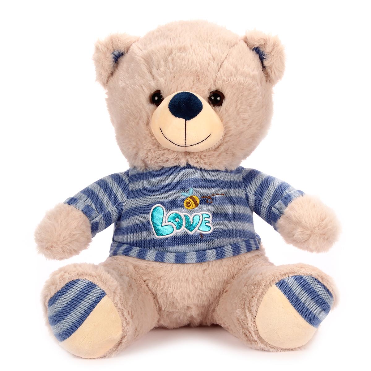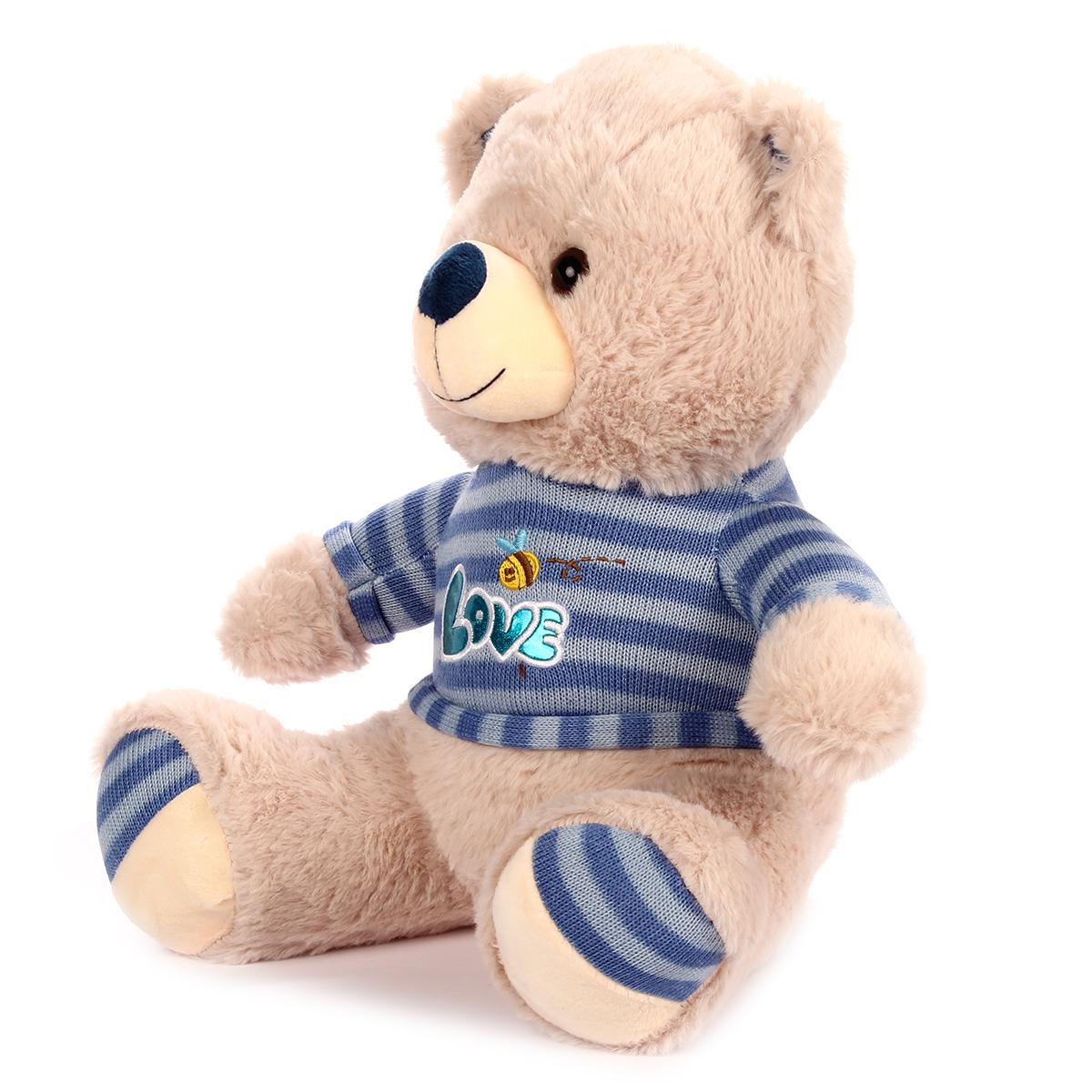 Медведь выполнен из светло-коричневого плюша и дополнен свитером в сине-голубую полоску с аккуратной вышивкой «Love» и декоративной пчелкой. Объемный нос, вышитая улыбка и аккуратные вставки на лапках придают игрушке выразительность и индивидуальность. Изделие мягконабивное, не содержит элементов питания и механизмов, что делает его безопасным для повседневного использования.
