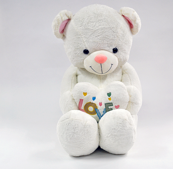 Игрушка выполнена в виде сидящего медведя с объемным сердцем в лапах. На сердце вышито слово LOVE разноцветными буквами и аккуратными декоративными элементами. Такой дизайн делает медведя подходящим вариантом для подарка на день рождения, 14 февраля, годовщину или просто как знак внимания близкому человеку.