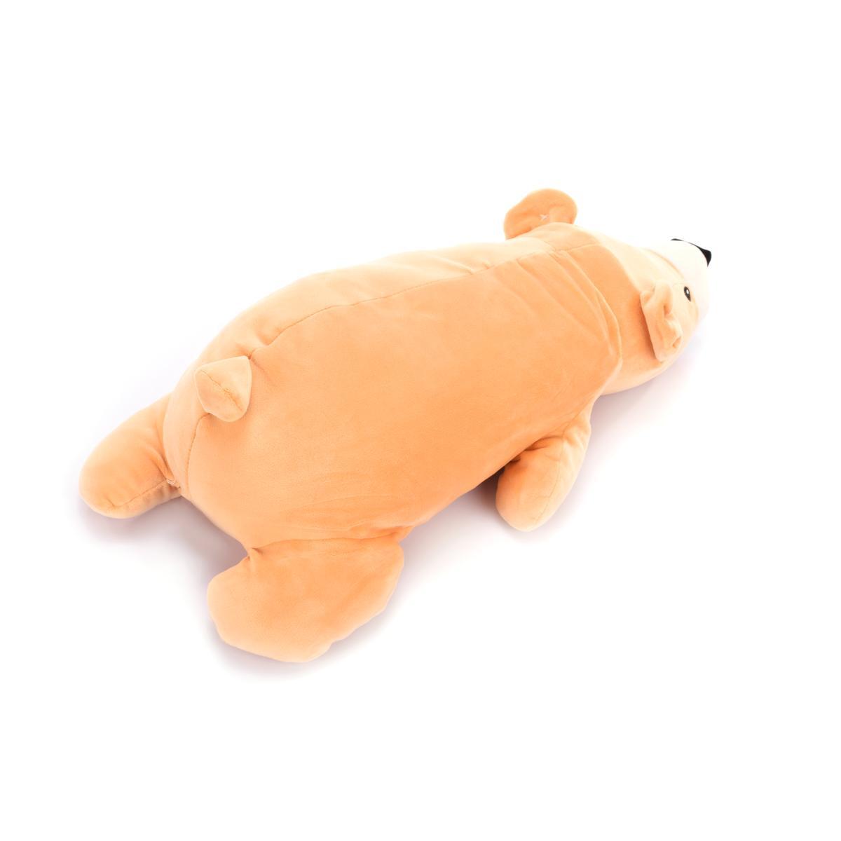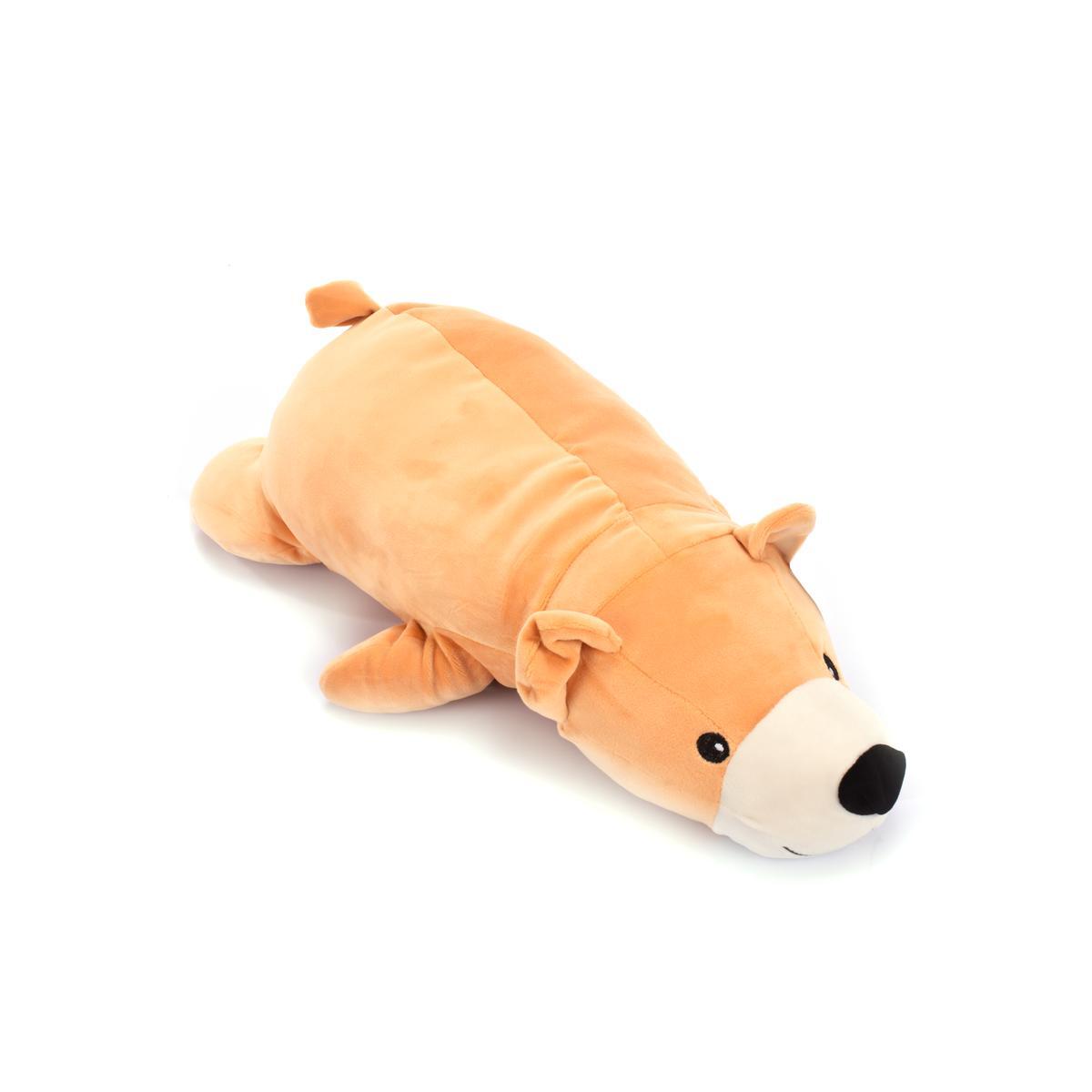 Медведь выполнен из искусственного меха и текстильного материала, а его набивка состоит из полиэфирного волокна, что обеспечивает долговечность и комфорт. Его светло-коричневый цвет с белыми деталями делает его привлекательным для детей. Размеры игрушки — 56 см, что позволяет использовать его как в качестве подушки, так и для игр.