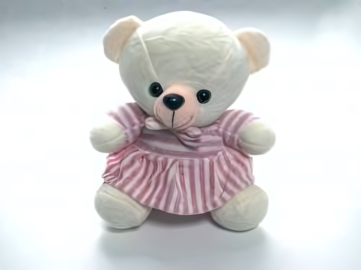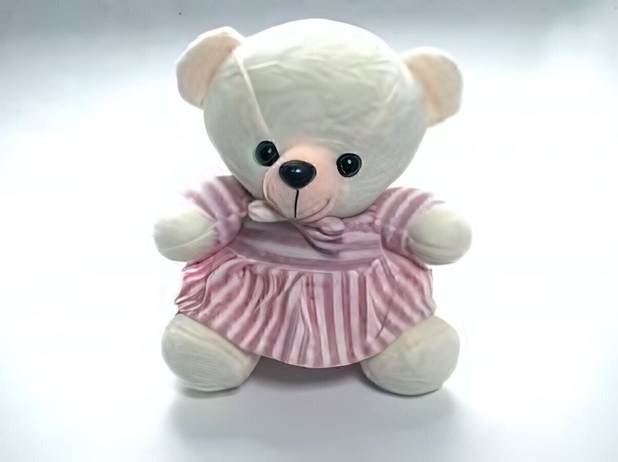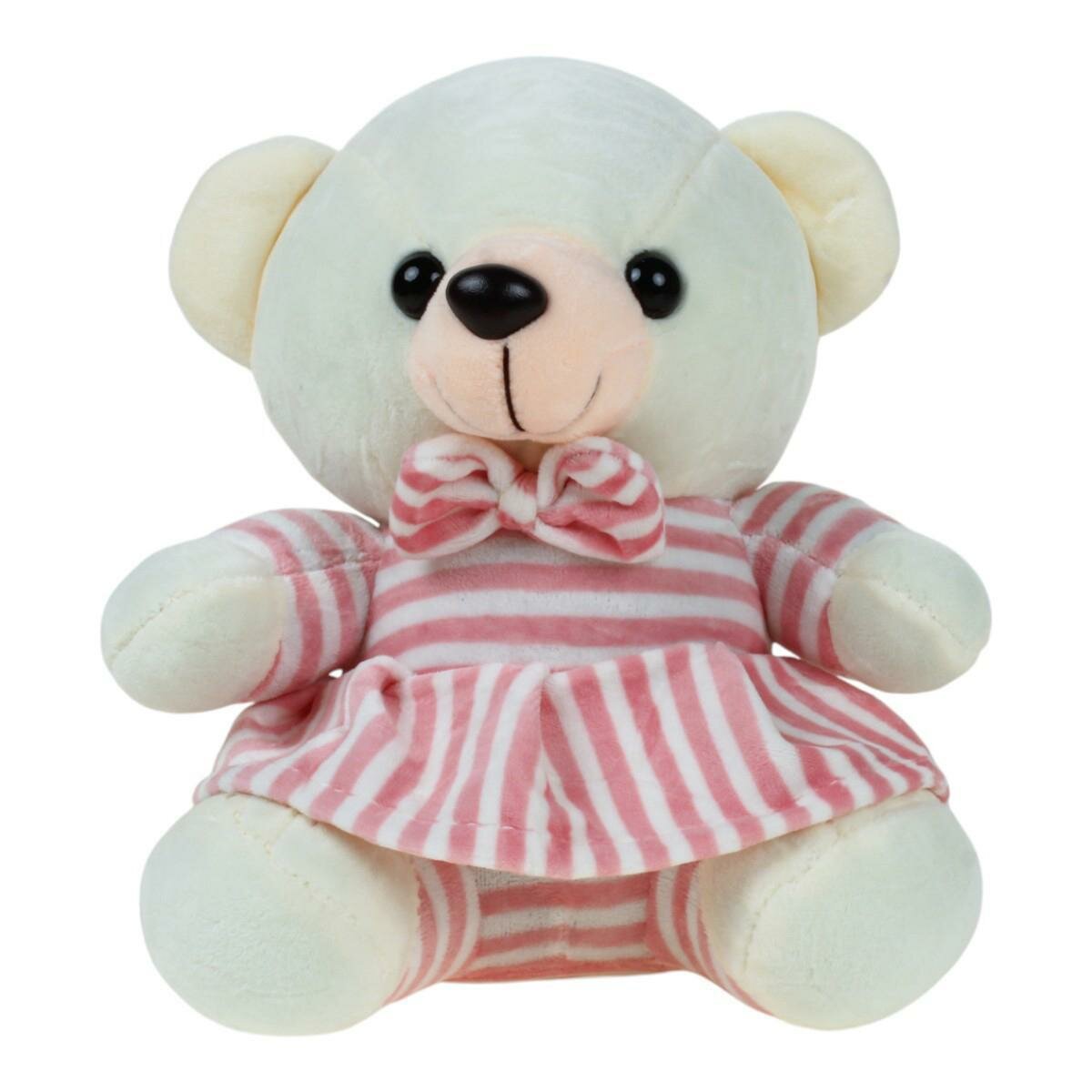 Подарите себе или близким кусочек уюта с этой мягкой игрушкой — медвежонком в нежном полосатом платье розового и белого цвета. Его добрые глазки и аккуратный бантик на воротнике моментально располагают к себе и вызывают желание взять его в руки.
