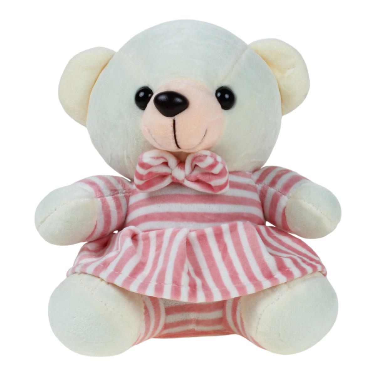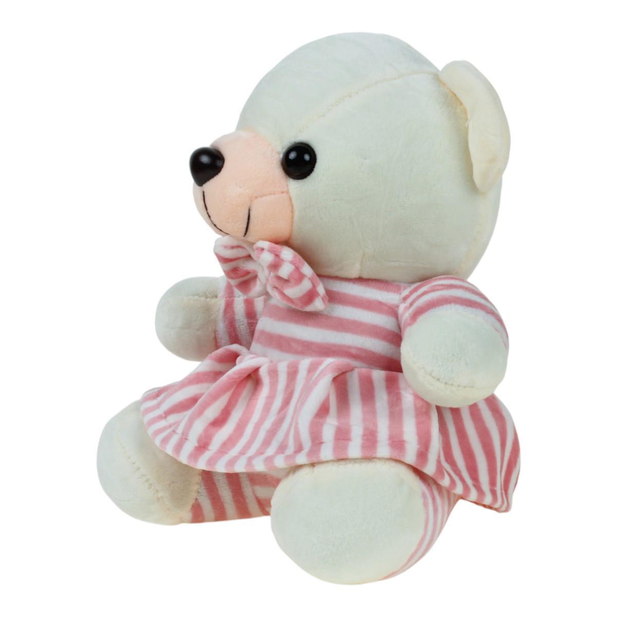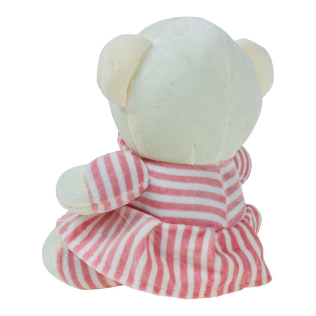 Подарите себе или близким кусочек уюта с этой мягкой игрушкой — медвежонком в нежном полосатом платье розового и белого цвета. Его добрые глазки и аккуратный бантик на воротнике моментально располагают к себе и вызывают желание взять его в руки.