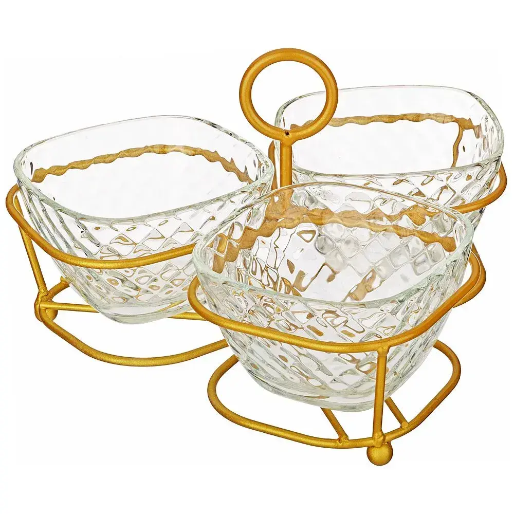 Менажница на подставке — идеальное решение для эффектной подачи закусок, соусов и десертов. Прочная конструкция из закалённого стекла и металла сочетает изысканный дизайн с функциональностью, делая сервировку удобной даже для больших компаний.