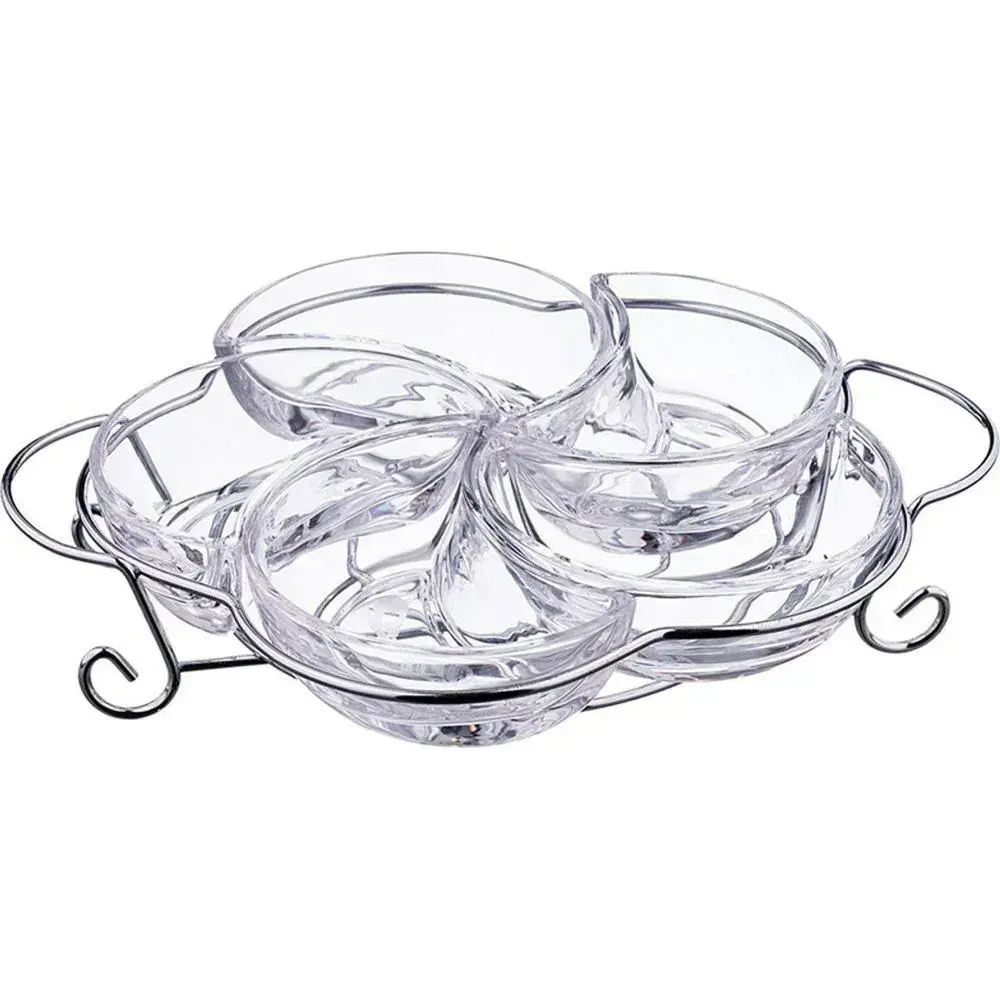 Стильный дизайн сочетает практичность и эстетику: прозрачные стенки демонстрируют содержимое, а рельефные бортики предотвращают смешивание продуктов. Металлическая основа с декоративными элементами придает сервировке законченный вид, превращая обычный обед в ресторанный ужин.