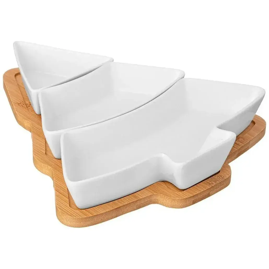 Менажница Lefard Native с тремя секциями в форме ёлки станет стильным акцентом вашей сервировки. Деревянная подставка и керамические емкости создают гармоничное сочетание натуральных материалов, подчеркивая изысканный вкус хозяйки.