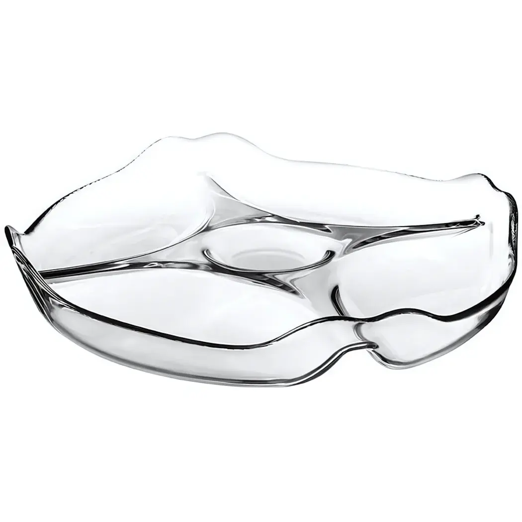 Менажница выполнена из закаленного стекла, что гарантирует её прочность и устойчивость к механическим повреждениям. Размеры не указаны, но она достаточно большая для подачи разнообразных закусок. Прозрачный цвет позволяет красиво демонстрировать содержимое, добавляя эстетическую ценность к вашему столу.