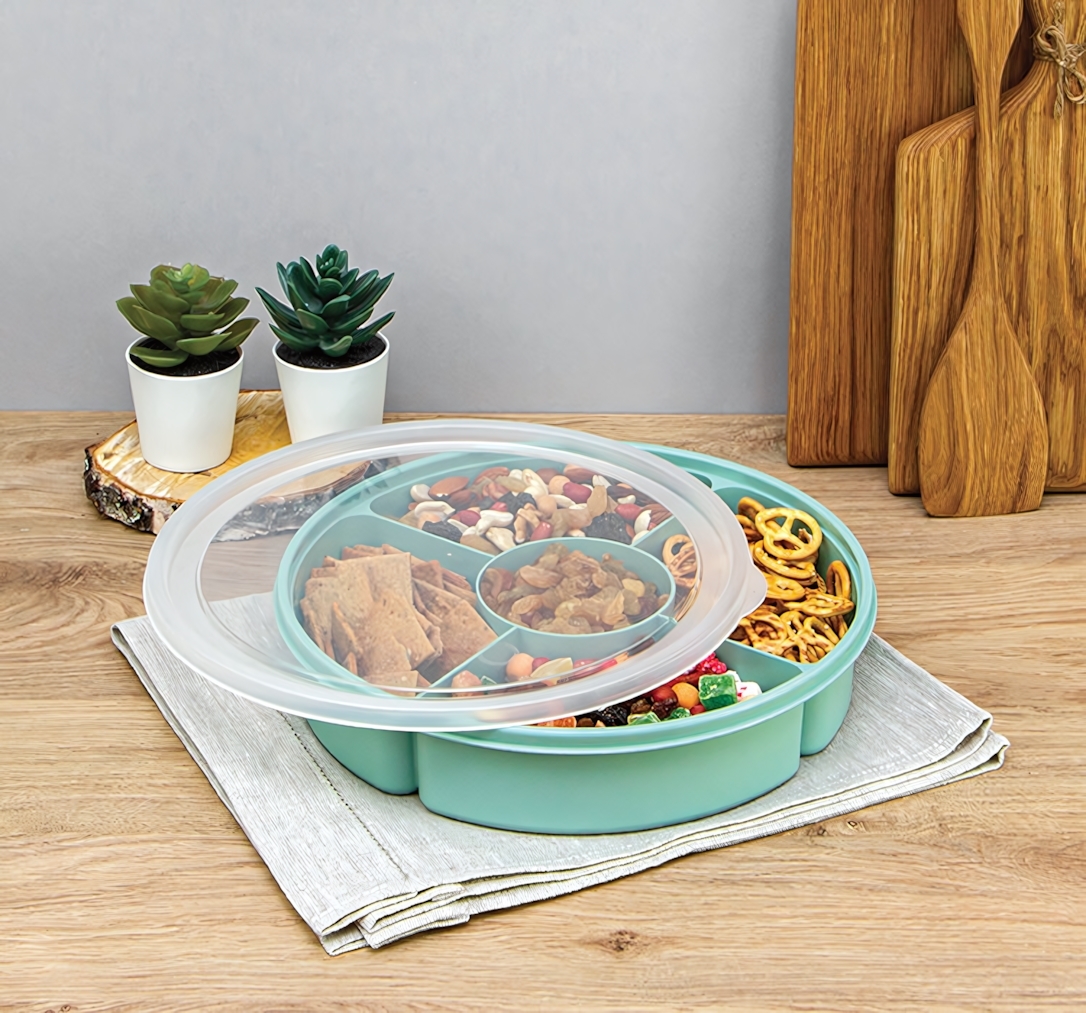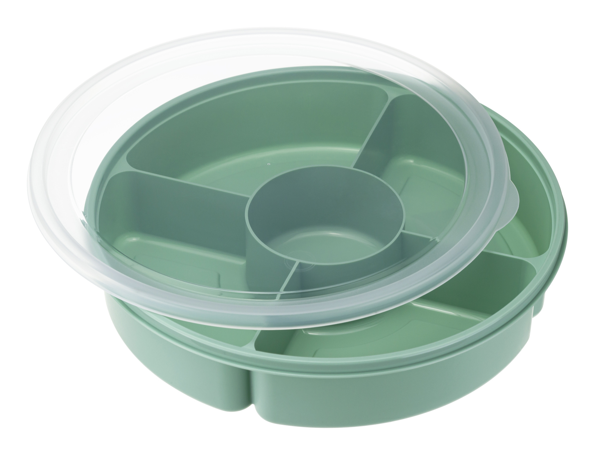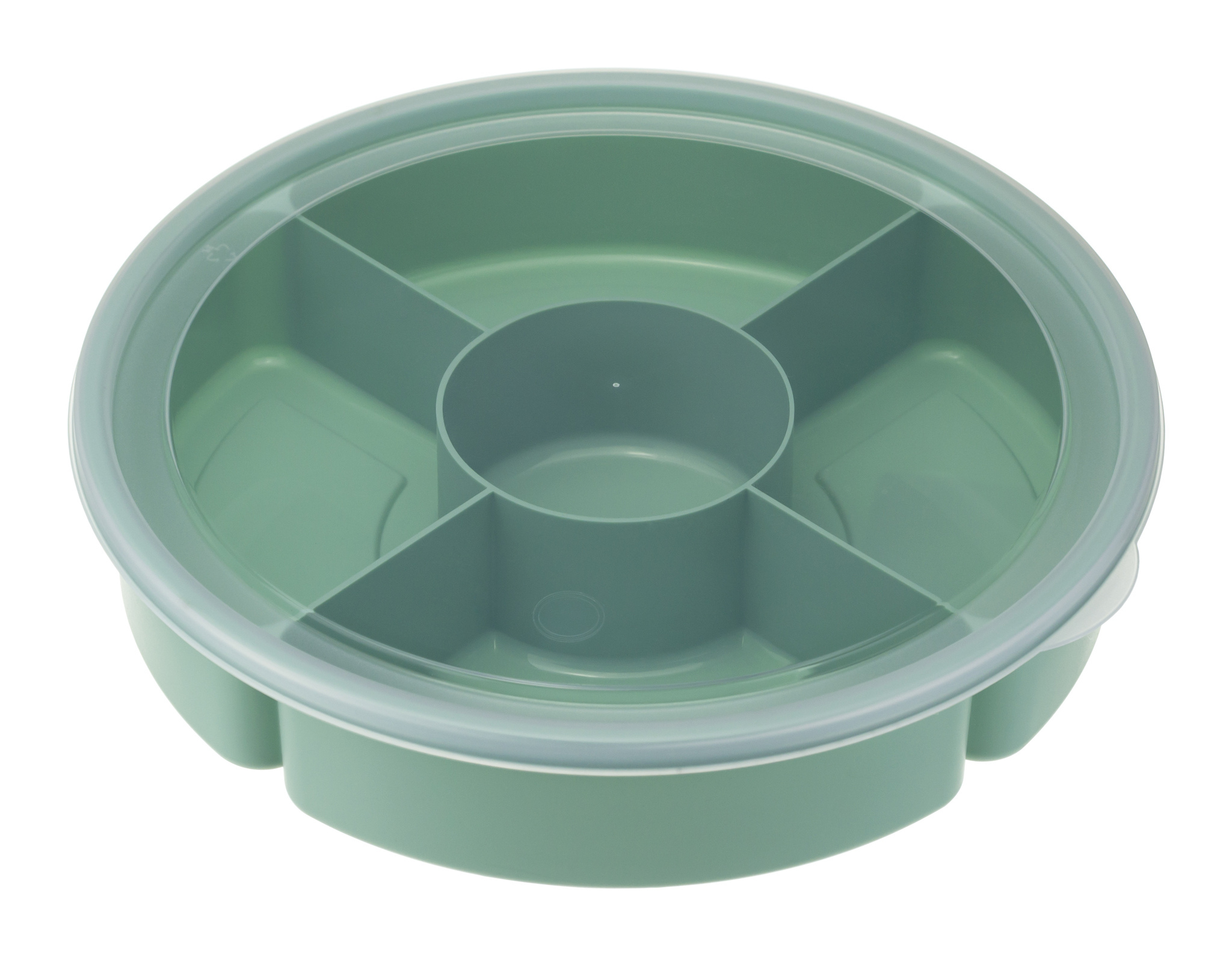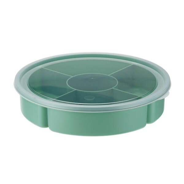 Размеры: диаметр — около 25 см, высота — 5,5 см. Контейнер разделен на 5 секций, каждая из которых рассчитана на разные вкусные закуски или продукты.