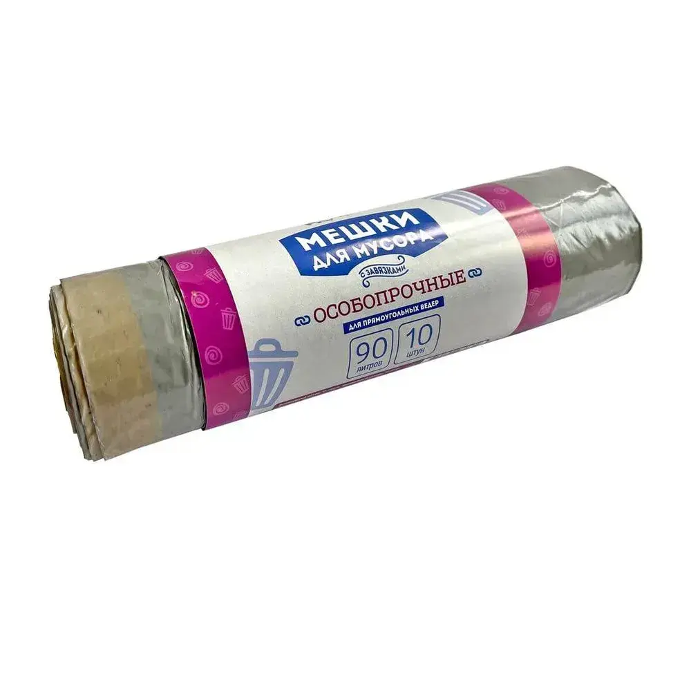 Мешки для мусора с завязками, 90л, 10шт в рулоне, ПВД 35мкм, особопрочные