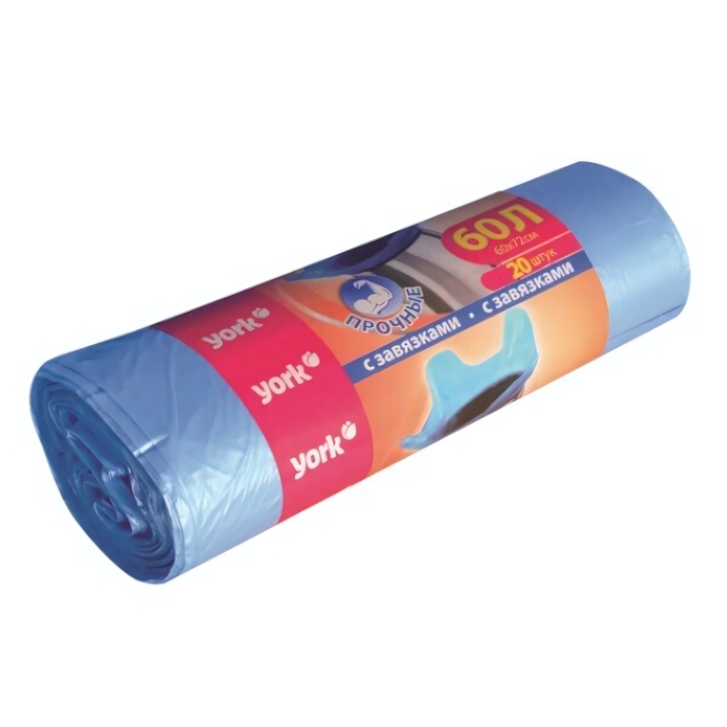 Мешки для мусора с завязками-ушками, 60л, 20 штук, ПНД 10 мкм, голубой YORK