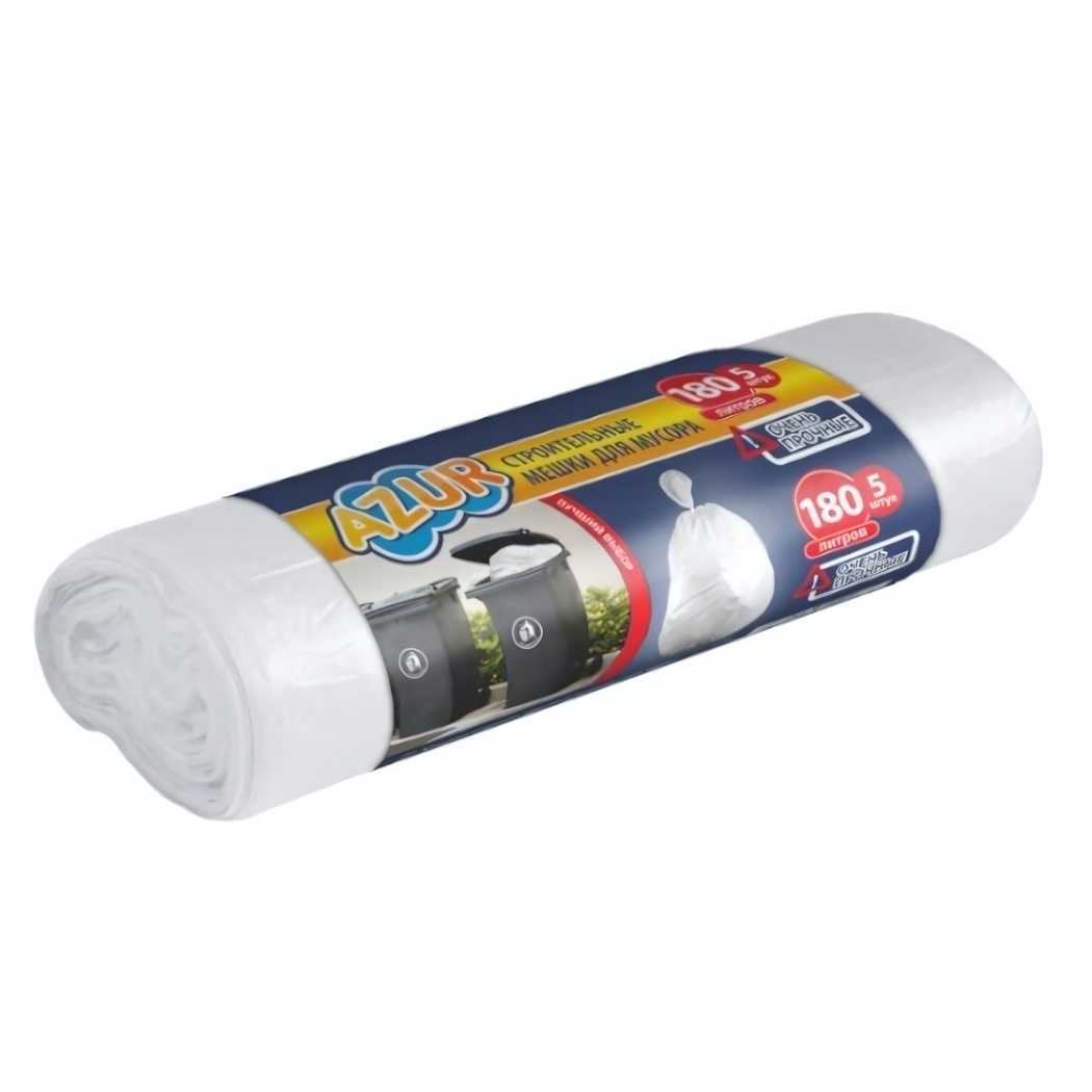 Практические детали: объем — 180 литров, толщина — 22 мкм, цвет — белый, материал — полиэтилен высокой плотности. Удобная цилиндрическая упаковка облегчает хранение и транспортировку. Товар произведен в России брендом AZUR, подходит для задач уличной, домашней и строительной уборки, обеспечивая надежность и комфорт в использовании.