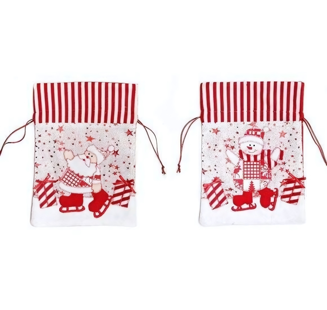 Форма прямоугольная, верх украшен полосатым узором, а основная часть — белая с красными элементами. На лицевой стороне располагается праздничный сюжет — либо Санта, либо снеговик. Завязки прочные, удерживают содержимое без риска выпадения. Этот мешок — простой и эффектный способ добавить яркость любому подарку.