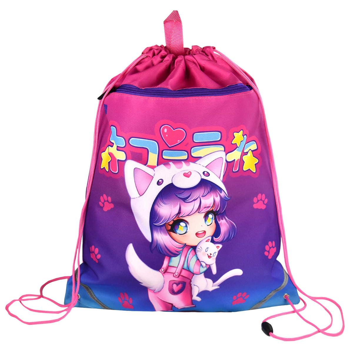 Мешок идеально подходит для детей и подростков, которые ценят оригинальный стиль. Градиентные оттенки розового и фиолетового создают игривое настроение, а милый персонаж с котенком вызывает улыбку.