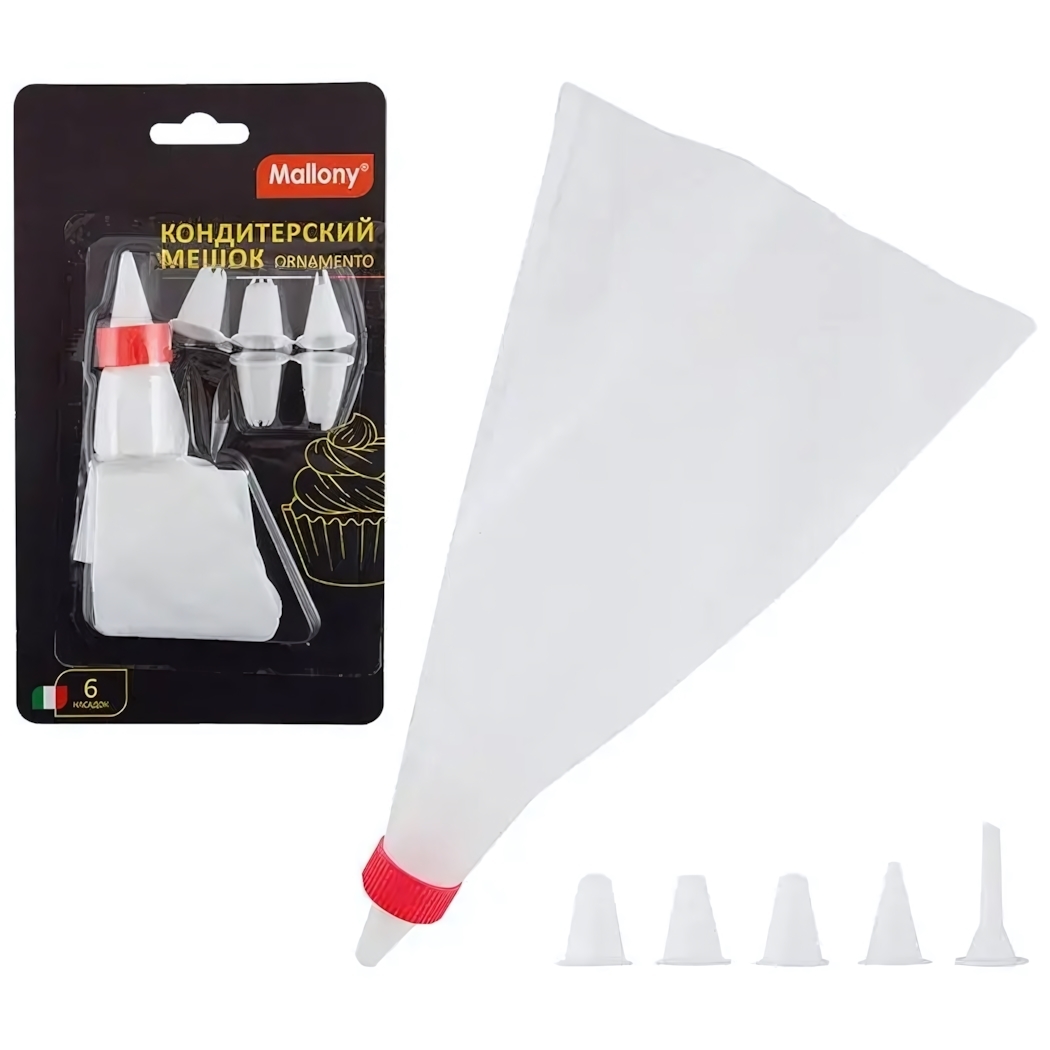 Комплектация: 1 кондитерский мешок из белого материала, 6 прозрачных насадок разных форм, пластиковый шприц с фиксатором. Все элементы упакованы в подвесную картонную основу с прозрачным окошком для демонстрации содержимого.