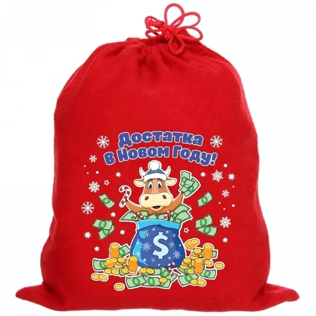 Создайте атмосферу праздника с подарочным мешком «Богатый бычок Тихон». Этот ярко-красный мешок станет идеальным решением для упаковки новогодних подарков, добавляя нотку веселья и уюта. Его оригинальный дизайн с изображением коровы, окруженной деньгами и снежинками, привлечет внимание и вызовет улыбку у получателя.