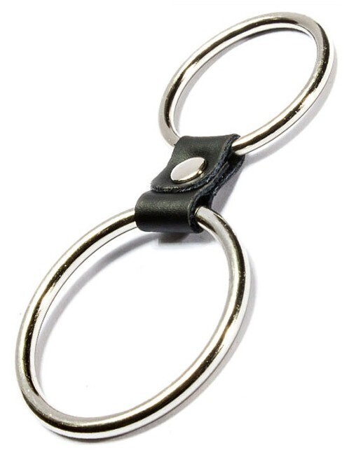 Эрекционное кольцо двойное, металл/кожа, черный/серебристый, диаметры 3,8 и 5 см