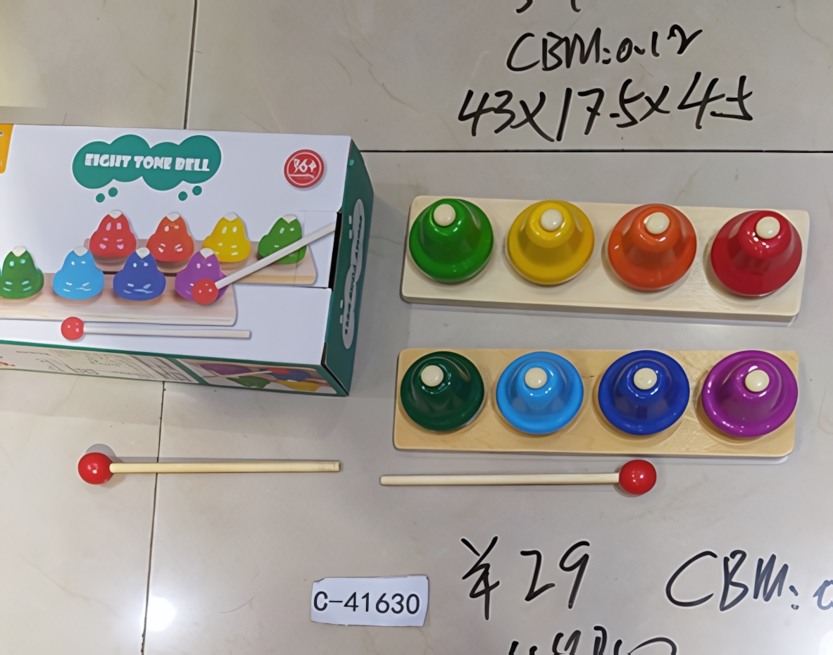 Компактный размер (23х12х7 см) позволяет брать игрушку на прогулки и в поездки. Натуральные материалы (дерево и металл) обеспечивают экологичность и долговечность использования. Каждый колокольчик издает чистый звук, помогая развивать музыкальный слух и чувство ритма.