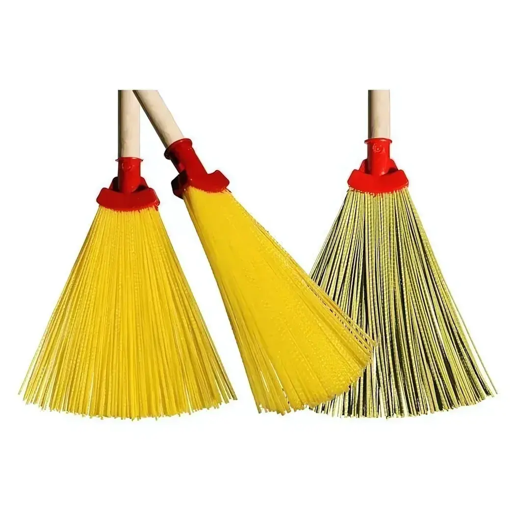Метла изготовлена из высококачественных материалов: жесткие желтые щетинки различной длины обеспечивают тщательную уборку, а прочная красная ручка гарантирует комфорт при использовании. Размер щетины подобран оптимально для быстрой уборки больших площадей.