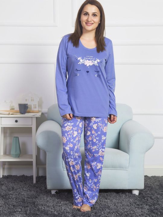 Главным украшением футболки является милый принт с мордочкой кошки, закрывающей глаза в сладкой дремоте, дополненный цветочным элементом и фразой "YOU ARE...". Этот рисунок добавляет образу игривости и индивидуальности. Брюки с цветочным узором гармонично дополняют верх, создавая целостный и стильный лук для дома.