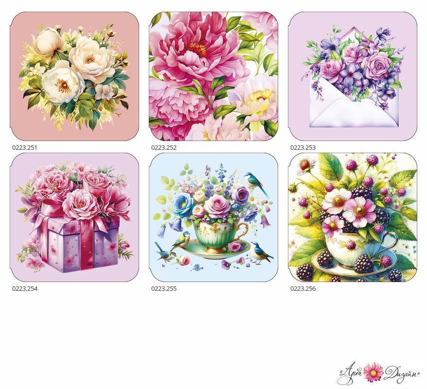 Квадратный формат 70х70 мм — золотая середина между стандартными открытками и крупными поздравительными форматами. Роскошные цветочные иллюстрации в розово-красной гамме создают праздничное настроение, а плотный картон (250 г/м²) сохраняет форму даже при пересылке почтой.