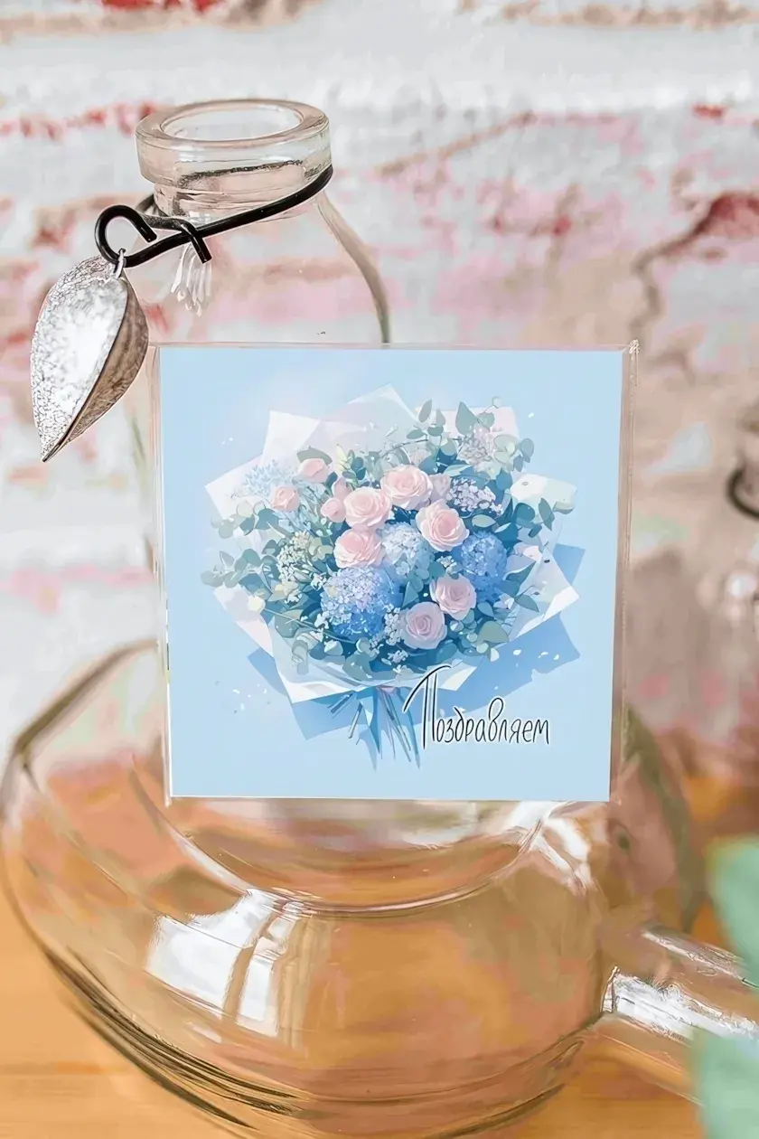 Размер открытки составляет 10х15 см, что делает её удобной для хранения и транспортировки. Голубой фон с изображением розовых и синих цветов, включая гортензии, создает гармоничное сочетание, которое понравится многим. Эта открытка станет отличным выбором для тех, кто ценит качество и стиль в мелочах.