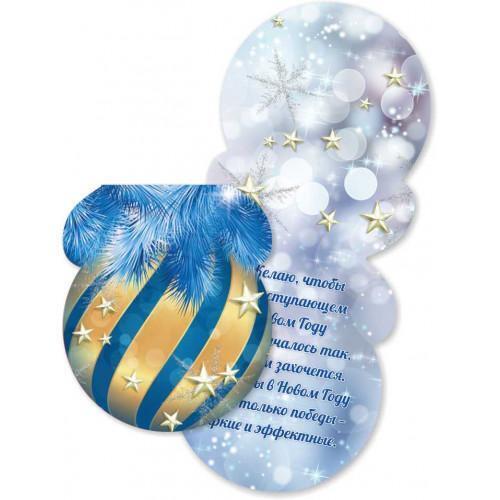 Мини-открытка новогодняя "Шар", сине-золотая, с пожеланиями, для поздравлений