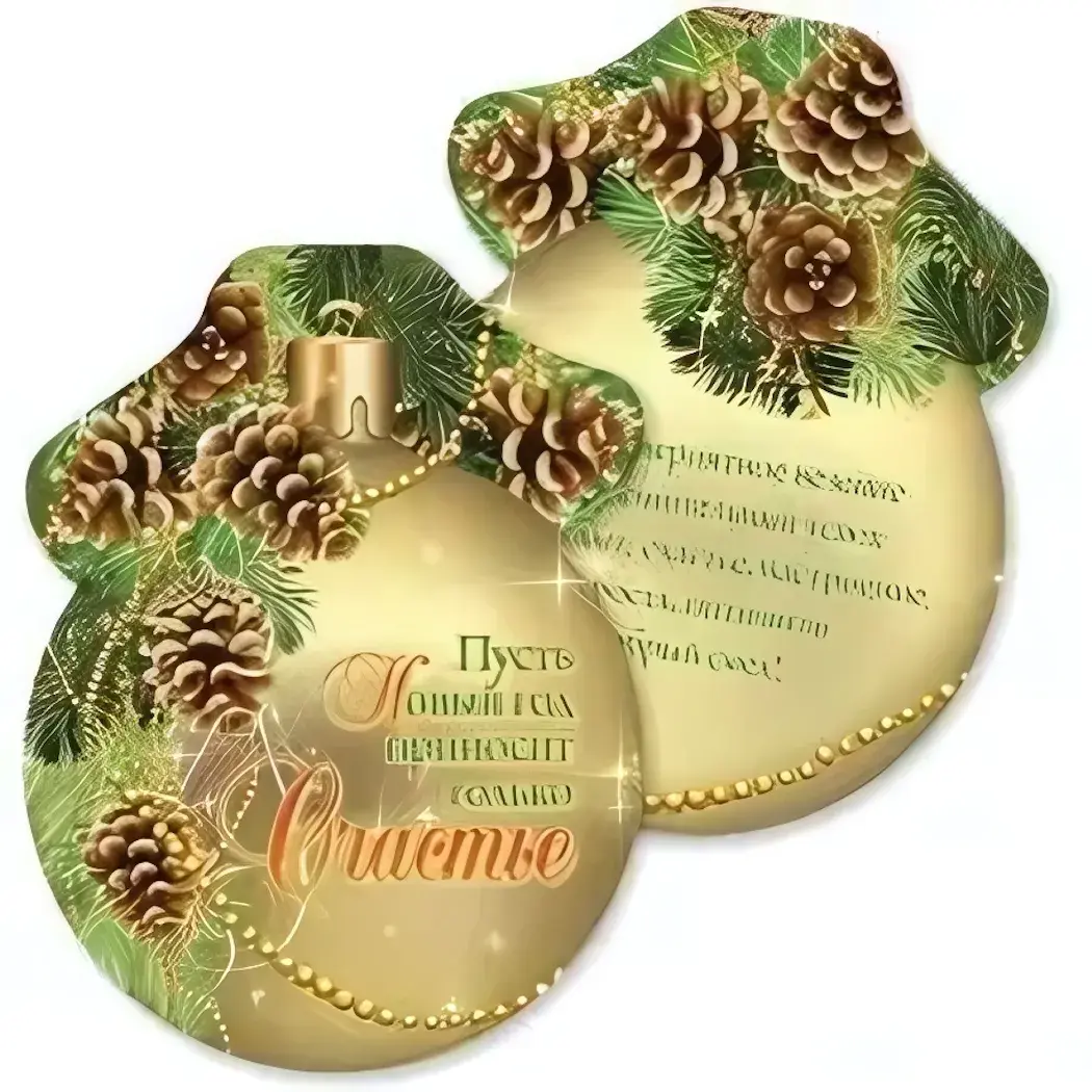 Мини-открытка новогодняя в форме шара с вдохновляющим пожеланием — идеальное дополнение к любому подарку или самостоятельный знак внимания. Благодаря компактному размеру её легко вложить в подарок, букет или даже отправить почтой, чтобы порадовать близких, коллег или друзей в самый волшебный сезон года.