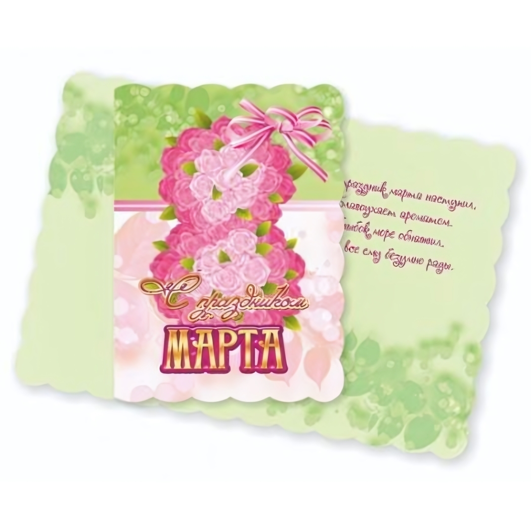 Каждая деталь открытки продумана до мелочей: нежные пастельные тона, элегантный букет розовых цветов и изящная каллиграфическая надпись создают безупречный образ весеннего праздника.