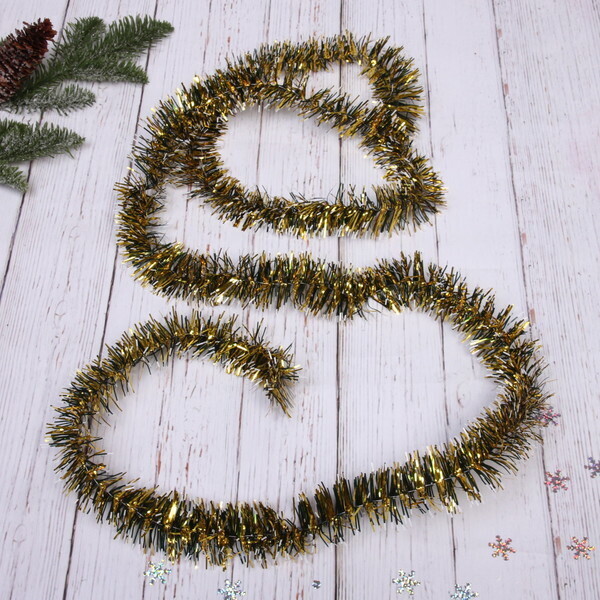 Мишура изготовлена из безопасного ПВХ, ширина 5 см, длина 2 метра, расцветка – золото и зелёный. Идеально впишется в праздничный интерьер, позволит оформить как небольшие, так и крупные зоны, не требуя дополнительных затрат времени на монтаж. Украсьте ваш дом с удовольствием, делая акцент на тепле и радости!