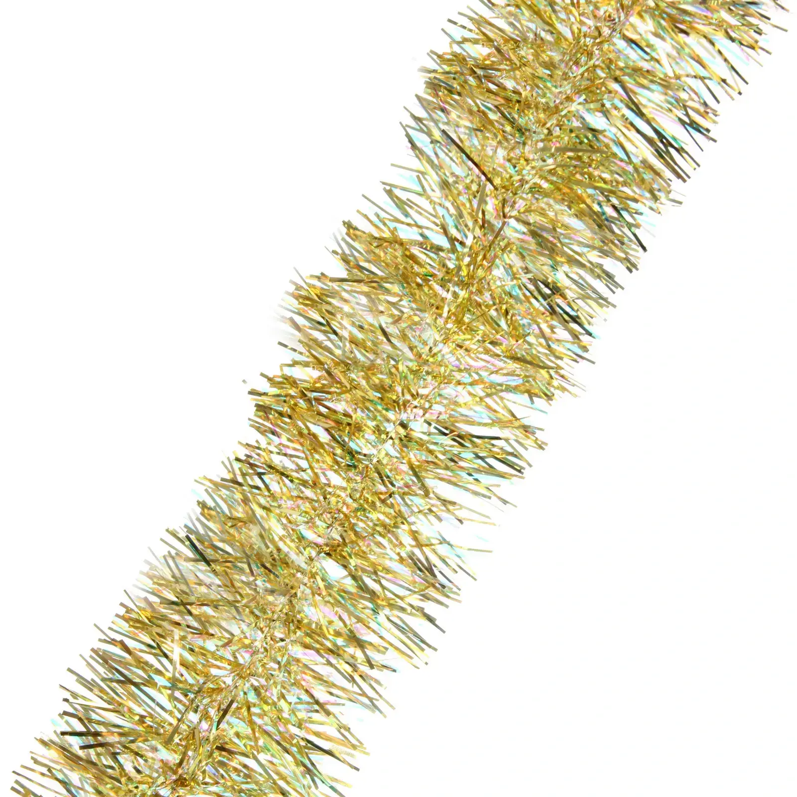 Мишура выполнена из ПВХ, что делает ее легкой и удобной в использовании. Золотистый цвет с радужными переливами добавляет изысканности и стиля. Длина 2 метра и ширина 9 см позволяют использовать ее в различных вариантах декора, создавая уникальные композиции. Не упустите возможность сделать ваш праздник ярче и красивее с мишурой «Блестящий вечер»!