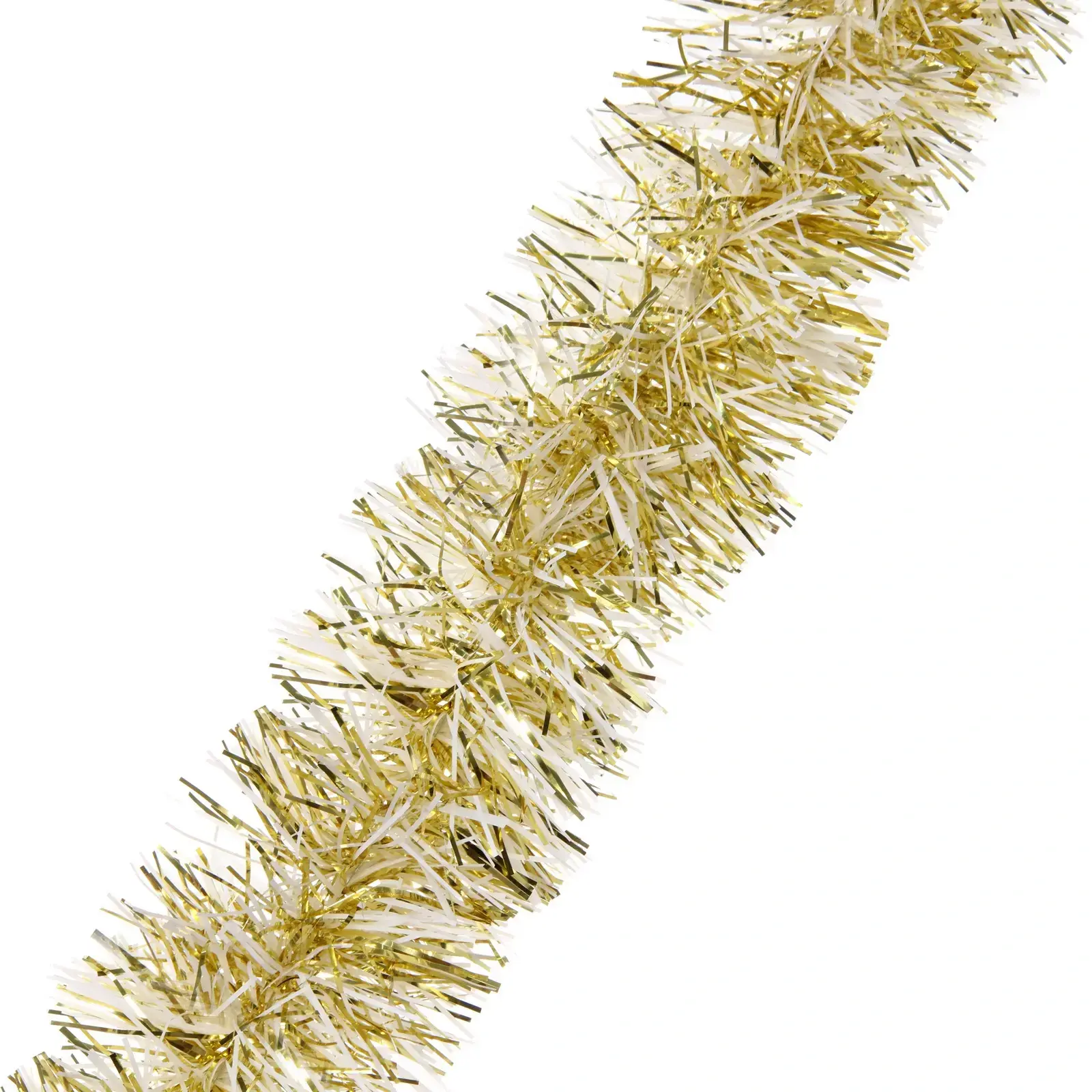 Мишура изготовлена из качественного ПВХ, что обеспечивает её долговечность и яркость цвета. Золотистый оттенок с белыми прядями создает эффектный контраст, который будет прекрасно смотреться в любом интерьере. Не упустите возможность сделать ваш праздник незабываемым с помощью этой великолепной мишуры!