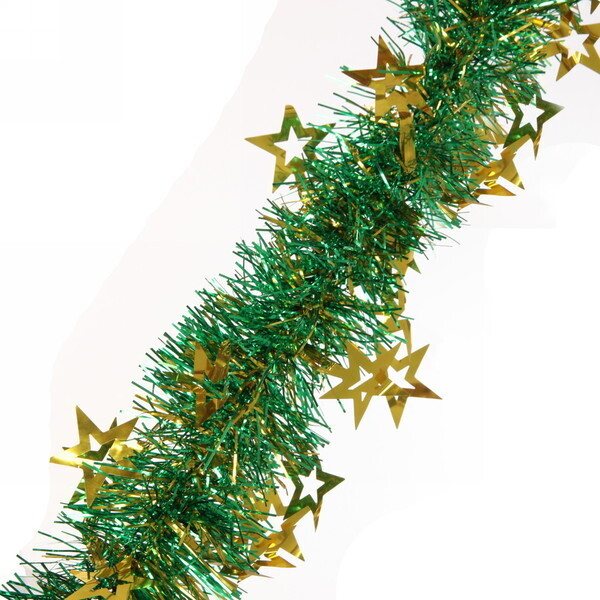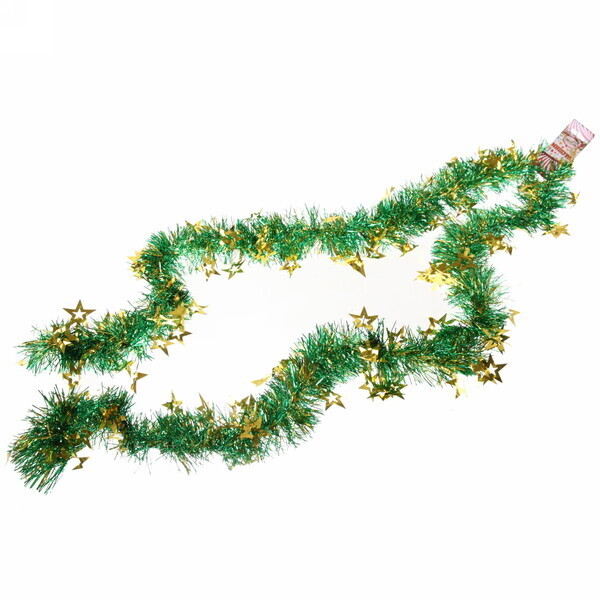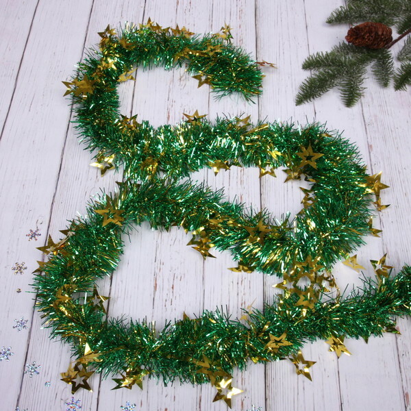 Размеры гирлянды: длина 2 метра, ширина 8 см. Основной цвет — зеленый, с золотыми звездочками, которые добавляют праздничный акцент. Эта мишура станет отличным выбором для создания новогоднего настроения и украсит ваш дом в самые волшебные дни года.