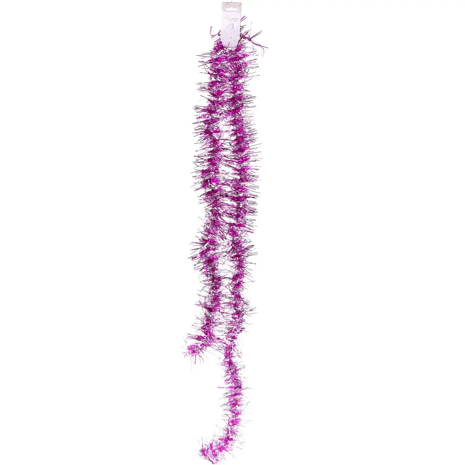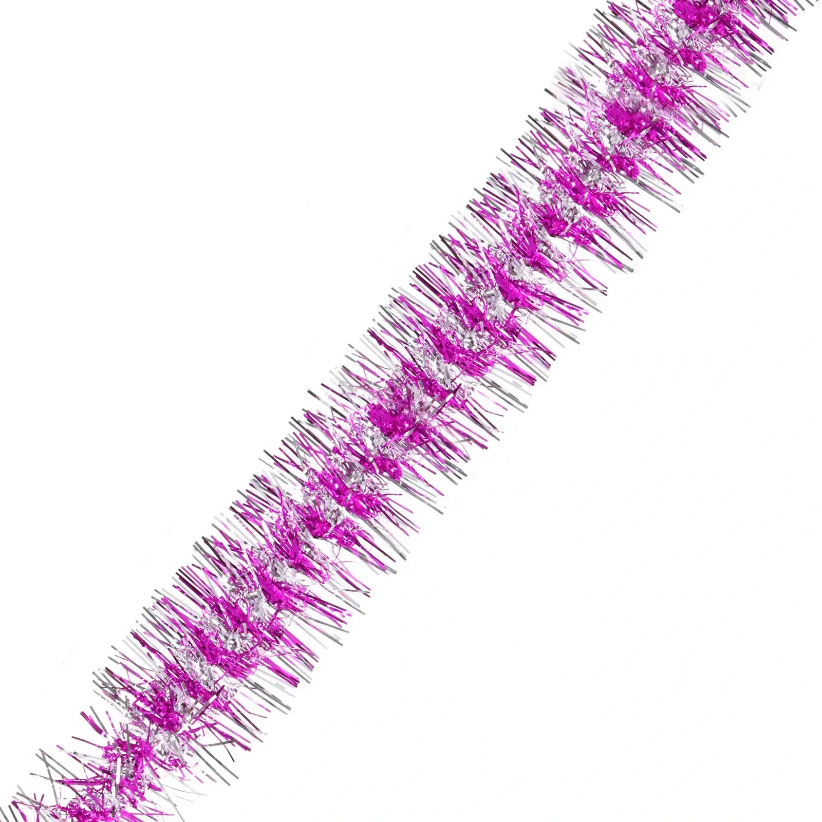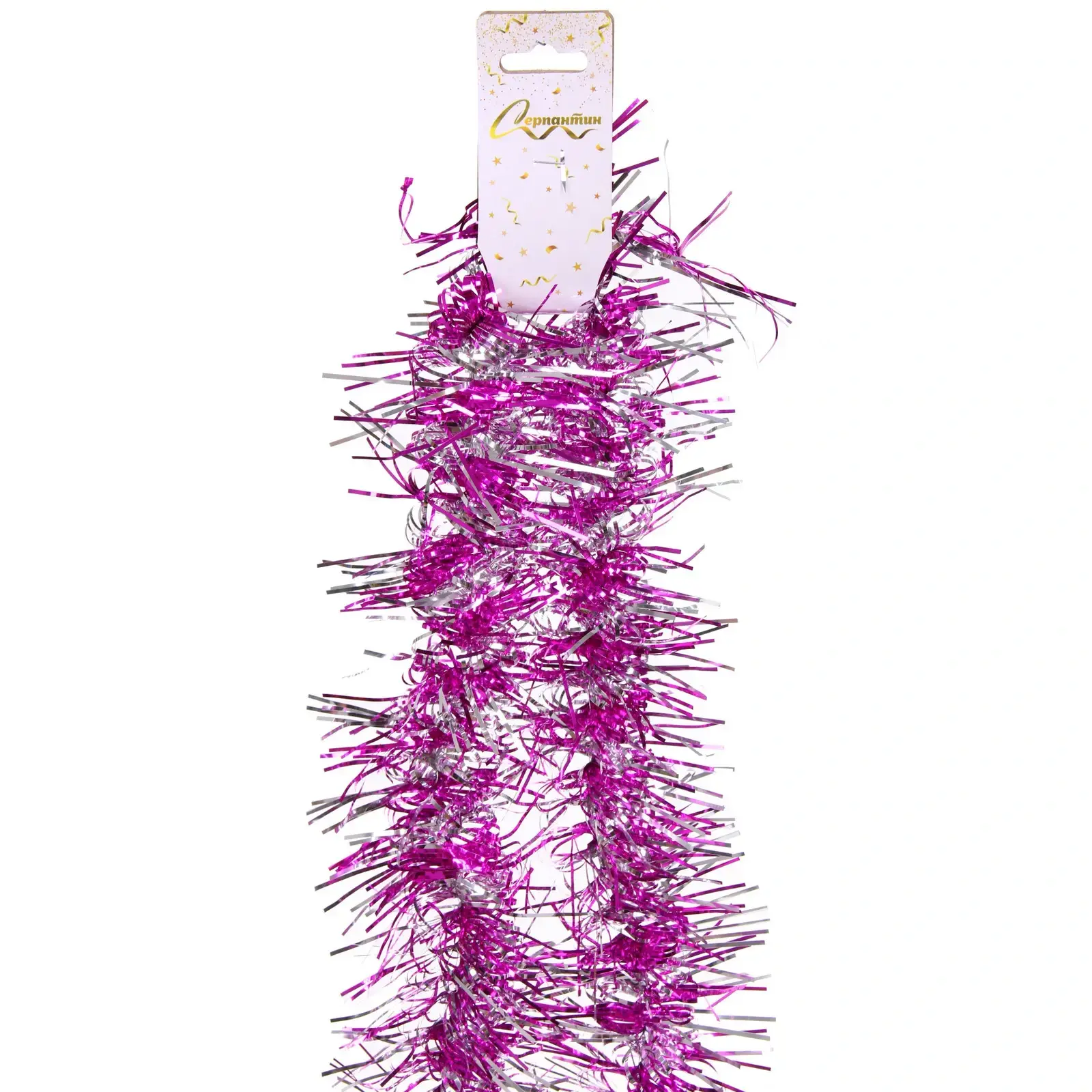 Мишура «Огонёк» длиной 2,09 м в сочных оттенках фуксии и серебра — идеальный выбор для декора новогодней елки, интерьеров и тематических мероприятий. Гибкие блестящие нити создают объемный эффект, переливаясь при любом освещении.