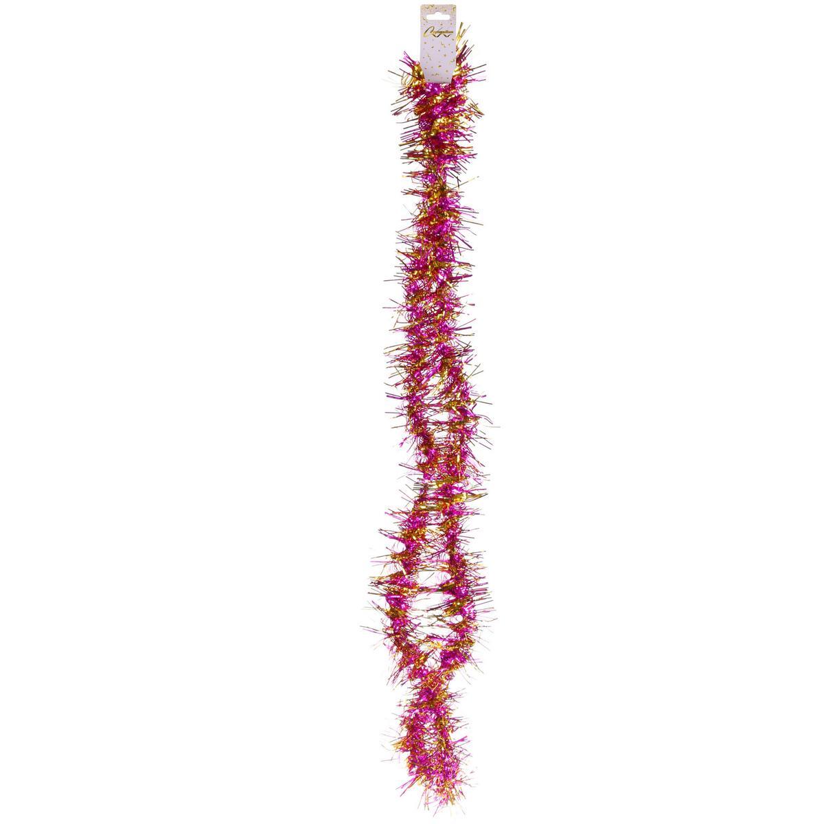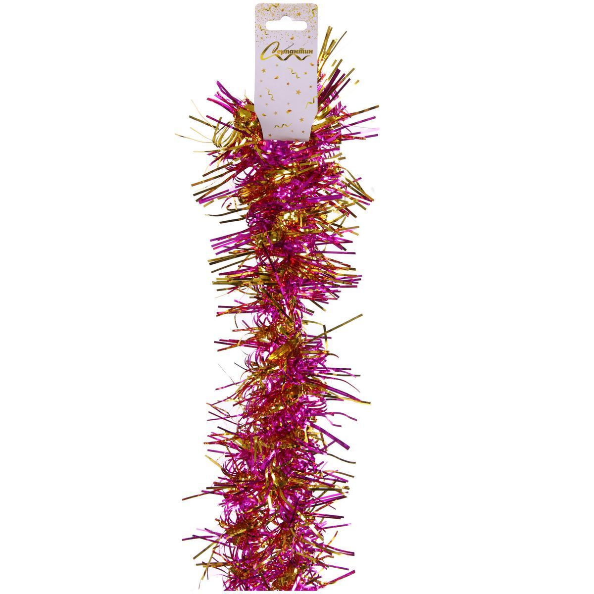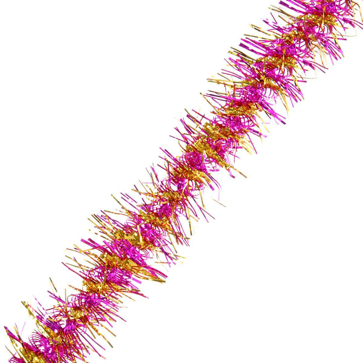 Эта мишура - идеальный способ добавить волшебства в ваш интерьер. Яркие цвета фуксии и золота делают её ярким акцентом в новогоднем декоре. Пушистая текстура и переливающийся блеск создают атмосферу радости и уюта, делая любое место подходящим для праздничного настроения.