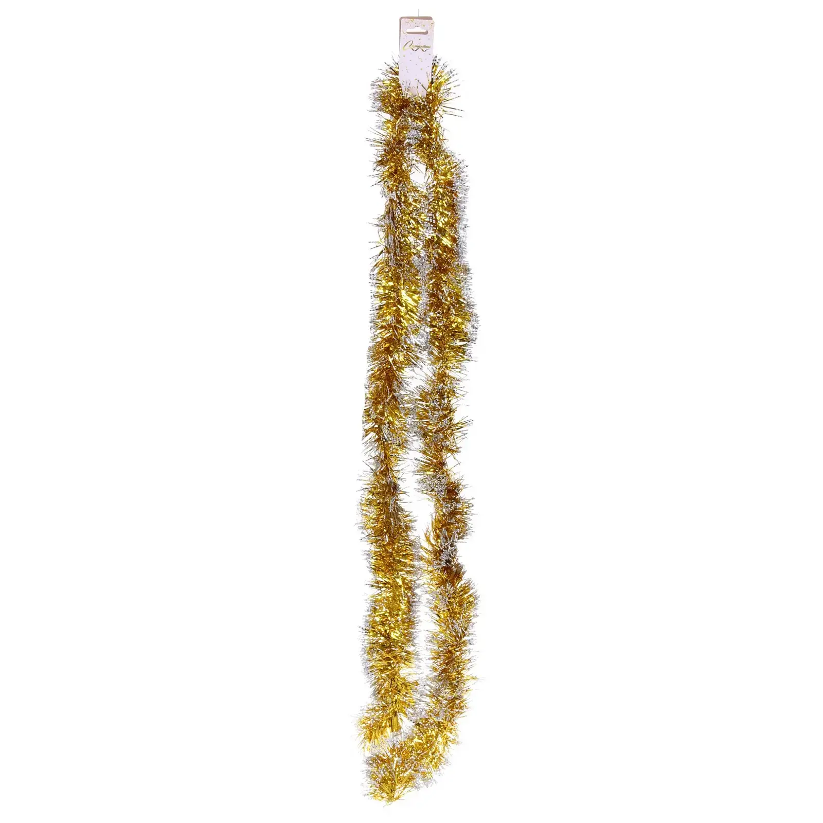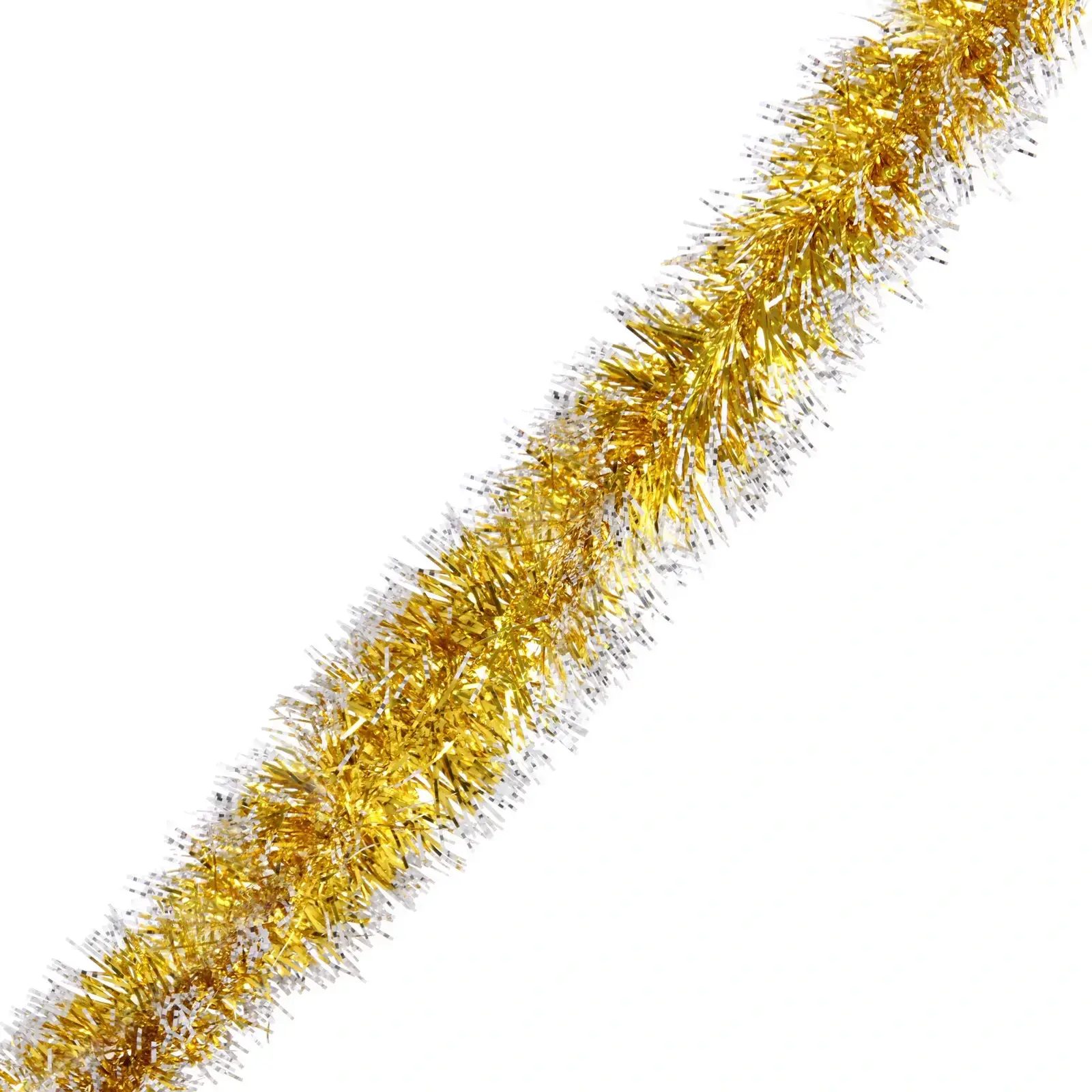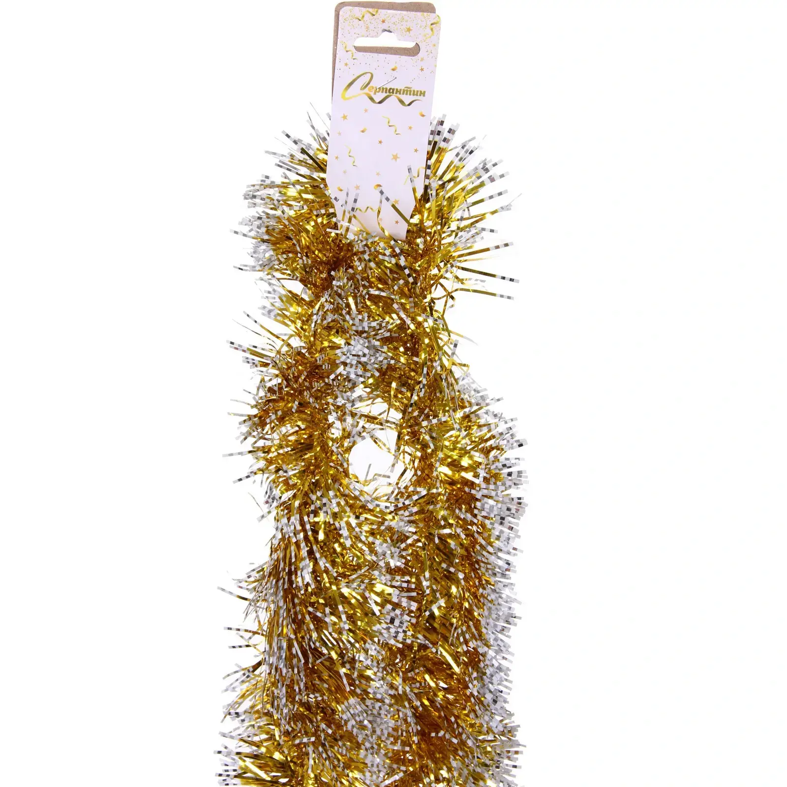 Мишура изготовлена из ПВХ, что обеспечивает ей прочность и устойчивость к повреждениям. Золотой цвет с серебристыми элементами создает эффектный контраст, который будет прекрасно смотреться в любом интерьере. Длина мишуры составляет 2 метра, а ширина — 9 см, что делает ее идеальной для создания объемных композиций.