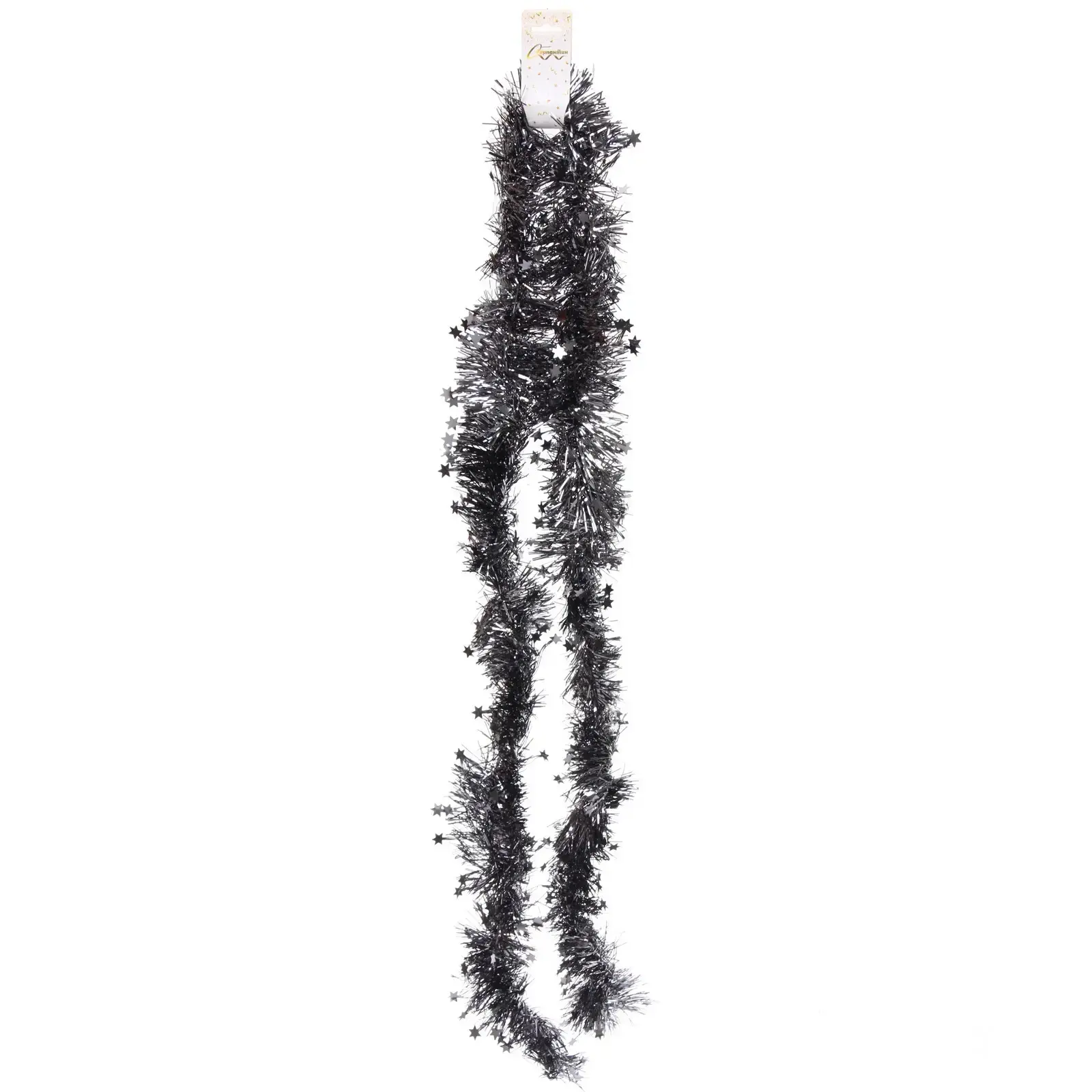 Длина мишуры составляет 2 метра 10 сантиметров, что позволяет использовать ее в различных вариантах декора. Материал — ПВХ, который обеспечивает долговечность и легкость в уходе. Мишура представлена в черном цвете с серебристым блеском, что делает ее универсальным элементом для любого стиля оформления.