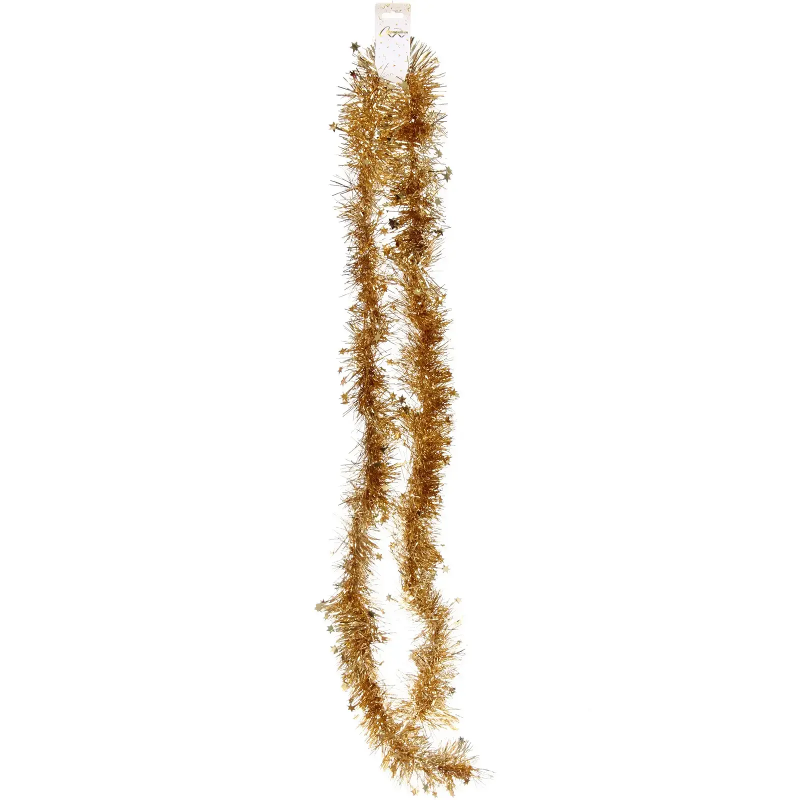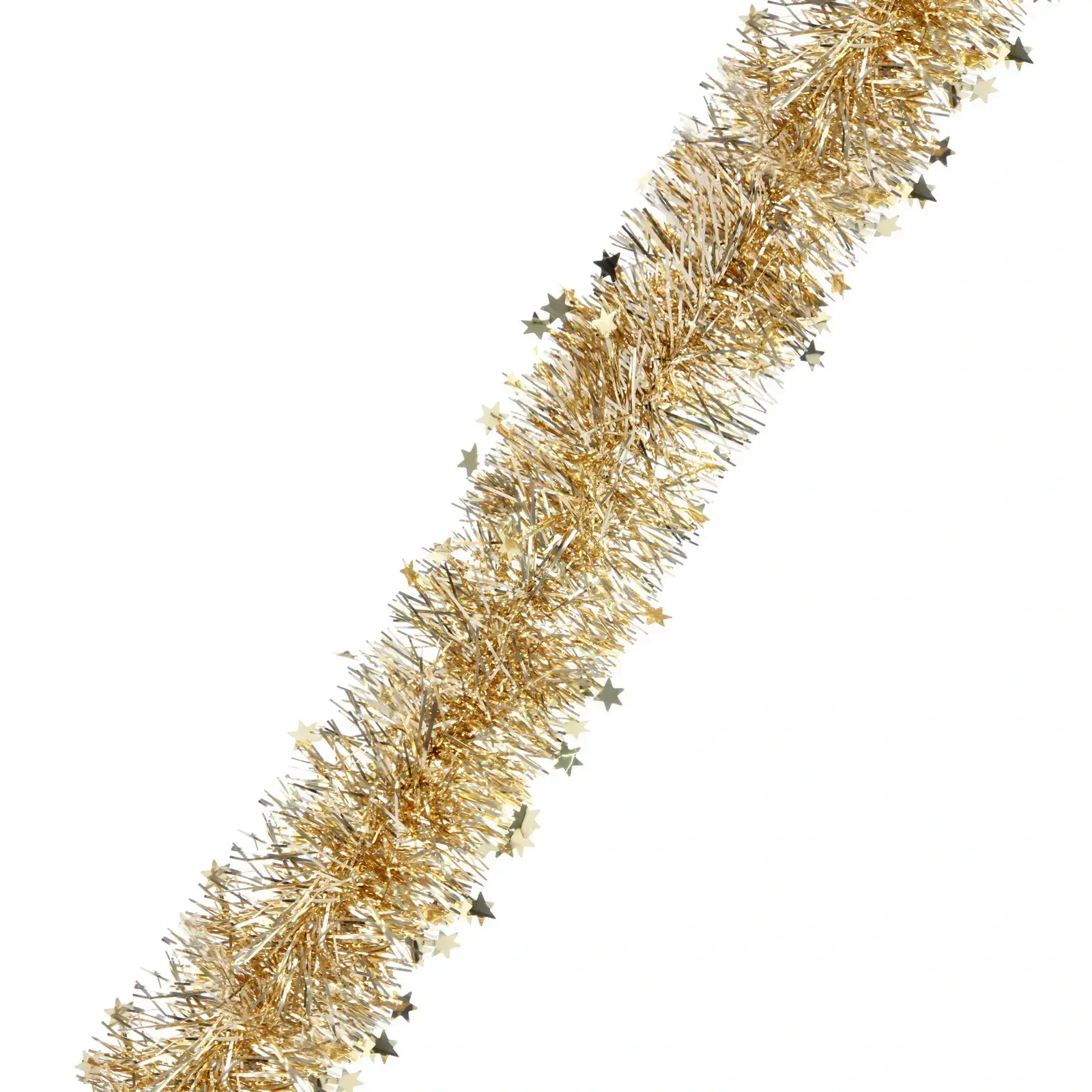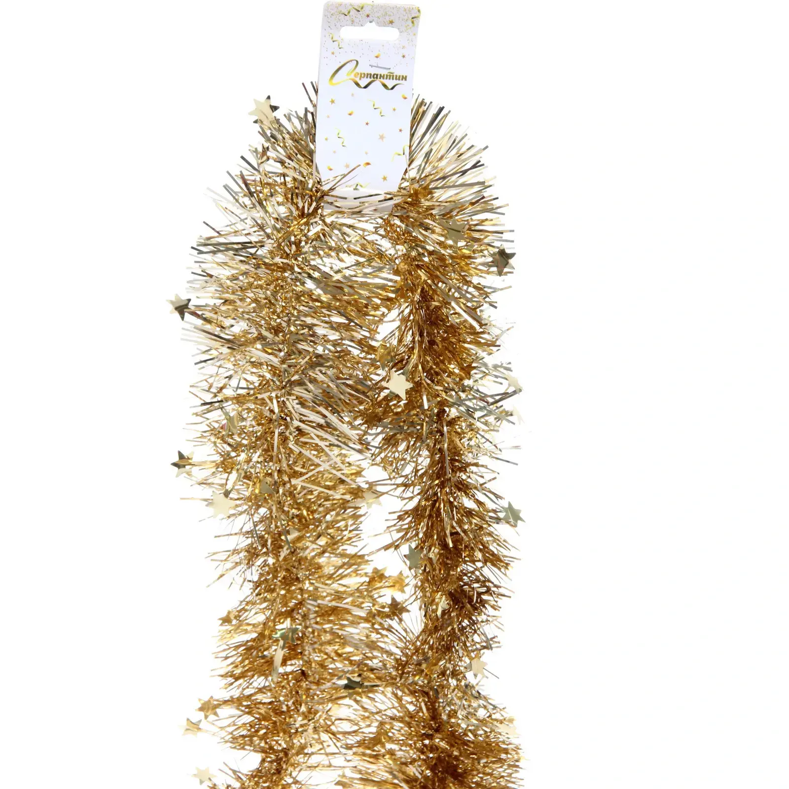 Длина мишуры составляет 2 метра 10 сантиметров, что позволяет использовать её для декорирования больших пространств. Основной цвет — золотистый, с добавлением серебристых звёздочек, что придаёт ей особый шарм. Мишура легка и удобна в использовании, что делает её идеальным выбором для быстрого и эффектного украшения.
