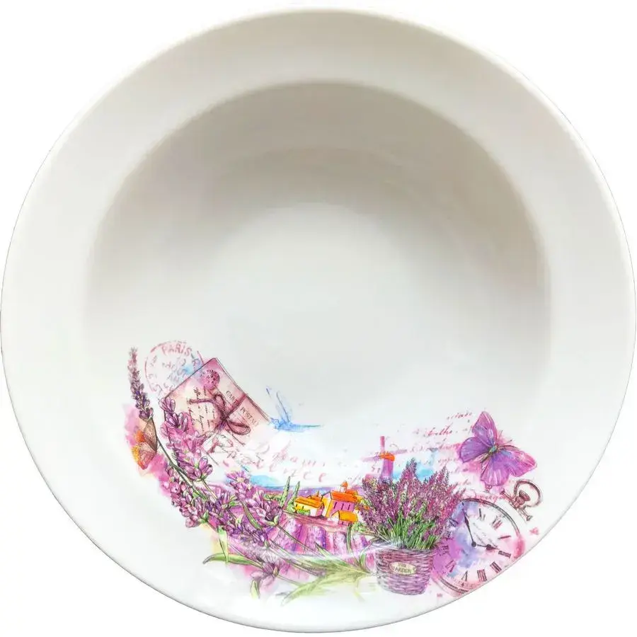 Подарите своим блюдам изысканное обрамление с миской из высококачественного фарфора. Нежный цветочный орнамент с лавандой и бабочками перенесет вас на солнечные поля Прованса, превращая обычный прием пищи в эстетическое удовольствие.