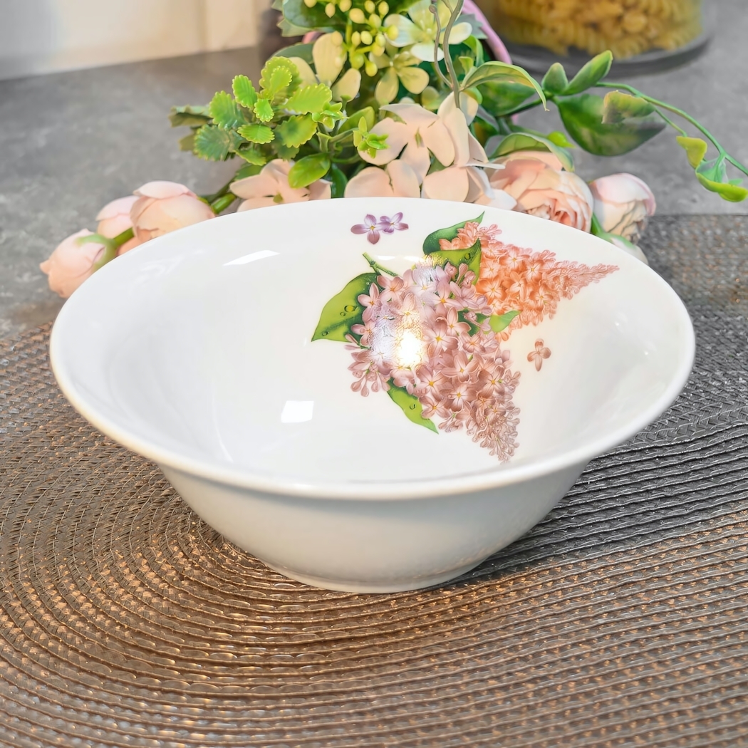Превратите каждую трапезу в особенный момент с элегантной фарфоровой миской 'Сирень'. Нежный цветочный узор и практичный объем 550мл делают ее идеальным выбором для подачи первых блюд, салатов или десертов.
