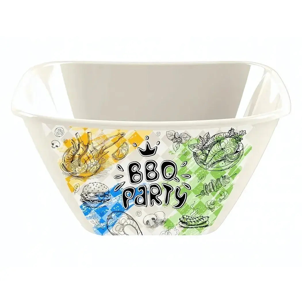 Порадуйте себя и гостей элегантной квадратной миской объемом 2 литра. Прочный безопасный полипропилен с ярким стойким принтом "BBQ PARTY" создает праздничное настроение за вашим столом.