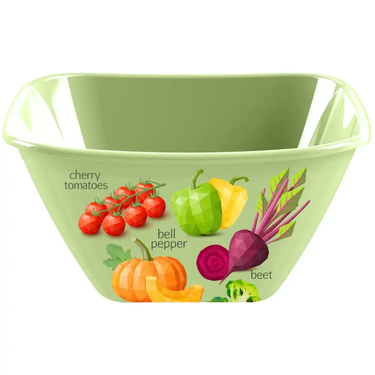 Квадратная миска объёмом 4л с ярким декором овощей станет практичным украшением вашего стола. Благодаря технологии IML-печати рисунок не стирается даже при частом использовании, сохраняя насыщенность цветов на долгие годы.
