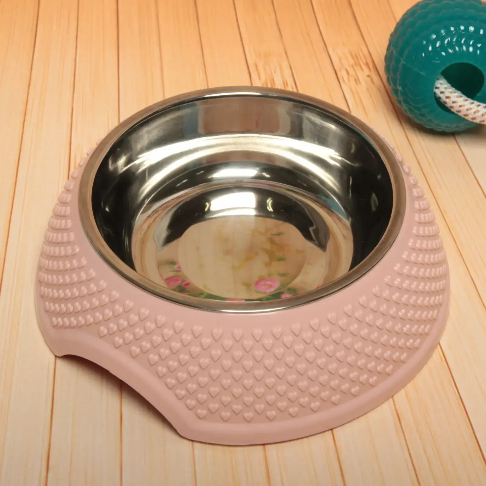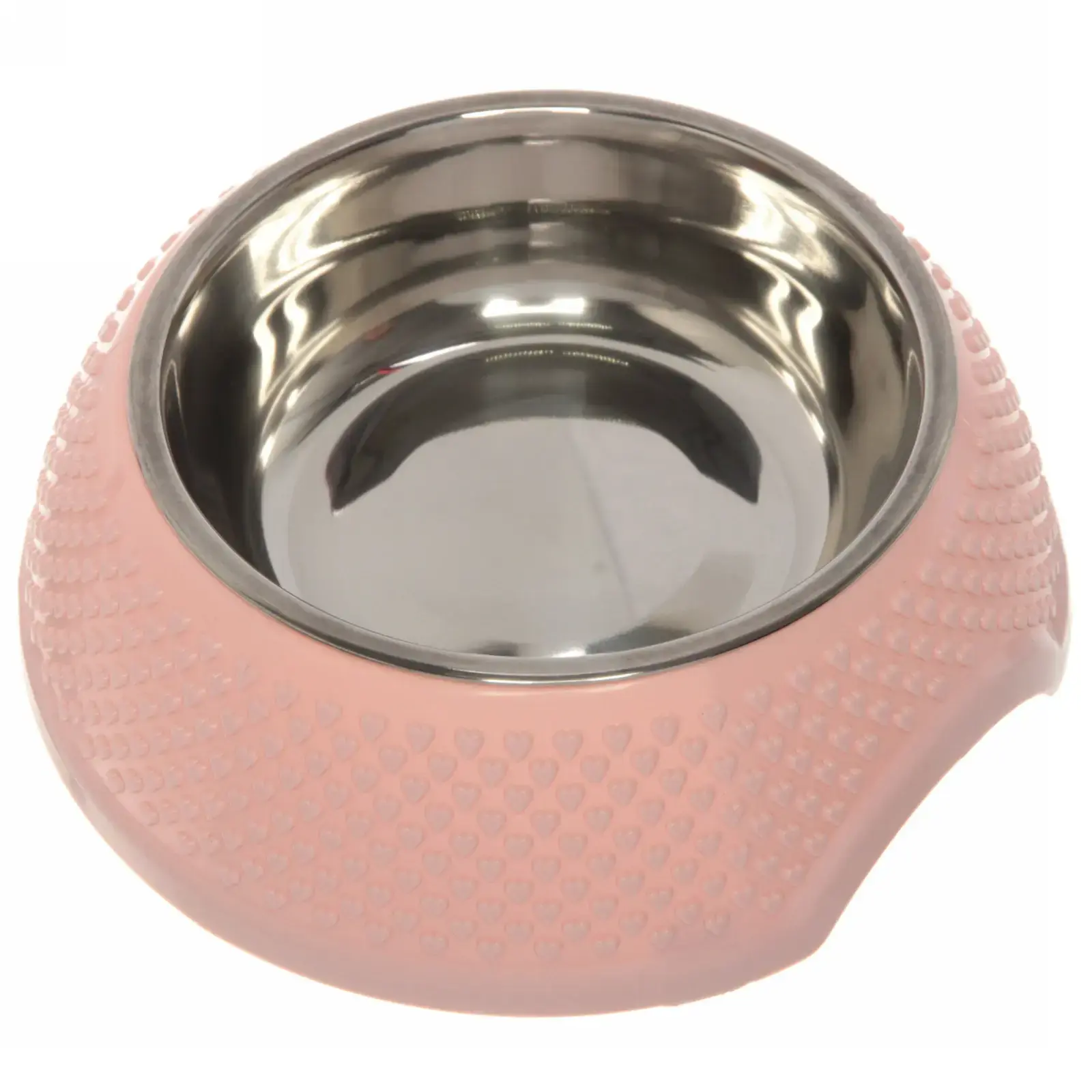 Внутренняя чаша из пищевой стали не впитывает запахи и устойчива к царапинам. Наружная пластиковая основа с декором в виде сердечек надежно фиксируется на полу благодаря резиновым элементам. Закругленные края защищают питомца от травм во время еды.