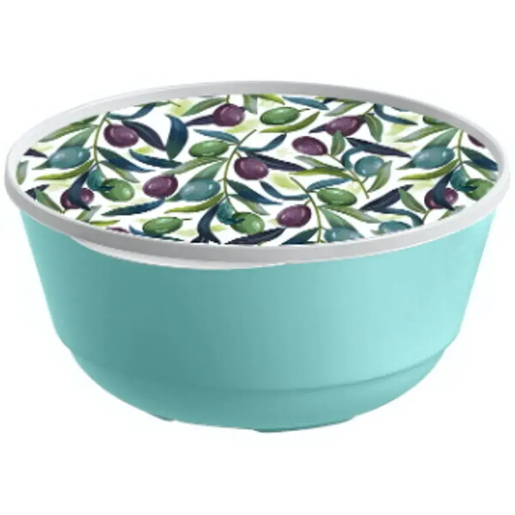 Объем миски составляет 2 литра, что позволяет готовить и хранить достаточно больших порций. Цвет крышки — зеленый, а декор с оливками и зелеными листьями добавляет изюминку в общий вид. Миска имеет округлую форму и гладкую поверхность, что облегчает ее мытье и уход.