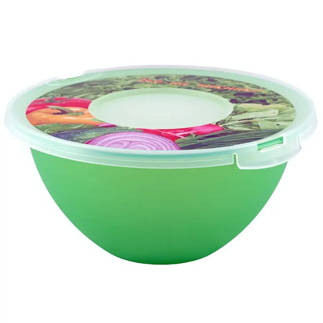 Почему стоит выбрать именно эту миску? Во-первых, она изготовлена из качественного пластика, который обеспечивает долговечность и надежность. Во-вторых, крышка с запирающим механизмом гарантирует, что ваши блюда останутся свежими и не потеряют свой вкус. В-третьих, яркий дизайн с изображением свежих овощей на крышке добавляет эстетики и подчеркивает предназначение товара.