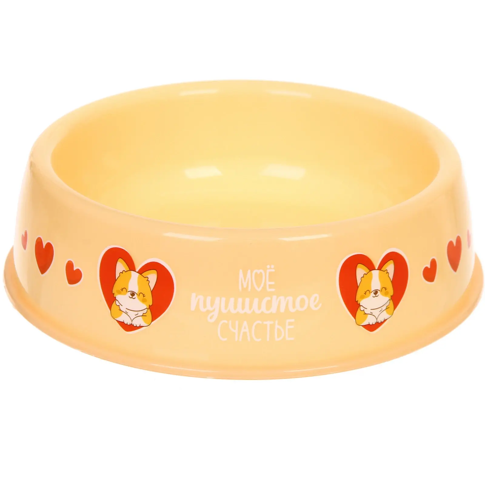 Размеры: диаметр 21 см, высота 6.5 см. Материал: прочный пищевой пластик без запаха. Цветовая гамма в бежевых тонах гармонично впишется в интерьер кухни или прихожей. Декоративный рисунок с изображением собаки корги и тематической надписью «МОЁ пушистое СЧАСТЬЕ» добавляет миске индивидуальности.