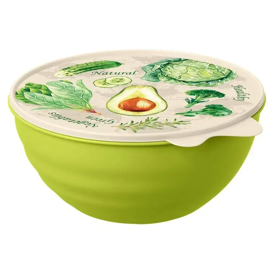 Пластиковая миска "WAVE" объемом 2.8 литра сочетает функциональность и стильный дизайн. Ярко-зеленый цвет и декор с изображением свежих овощей создают атмосферу натуральности, а надписи "Natural" и "Healthy" подчеркивают вашу заботу о здоровом питании. Герметичная крышка обеспечивает надежное хранение продуктов, сохраняя их свежесть и аромат.