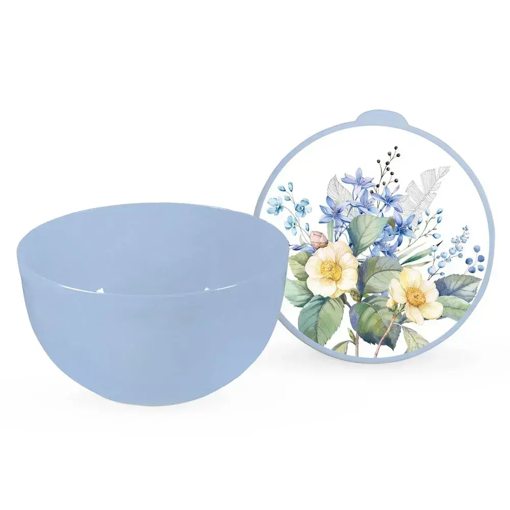 - Эстетичный дизайн: светло-голубая миска и крышка с цветами украсит любую кухню