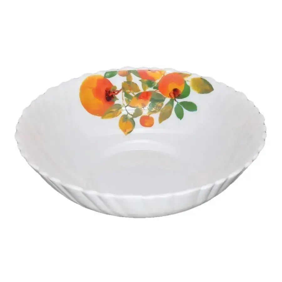 Рельефные волнообразные края и яркий фруктовый принт превращают обычную посуду в элемент декора. Теплая цветовая гамма рисунка (оранжевый, желтый, зеленый) гармонично впишется в кухонный интерьер.