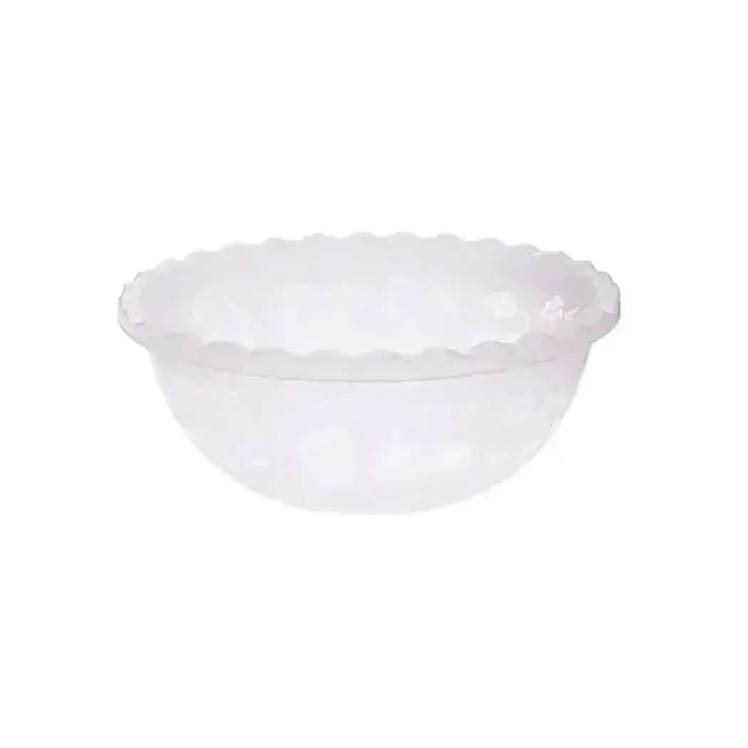 Прозрачная пластиковая миска объемом 3,5 литра с декоративным рельефным узором сочетает функциональность и эстетику. Идеальный выбор для хранения продуктов, сервировки блюд или использования на пикниках.